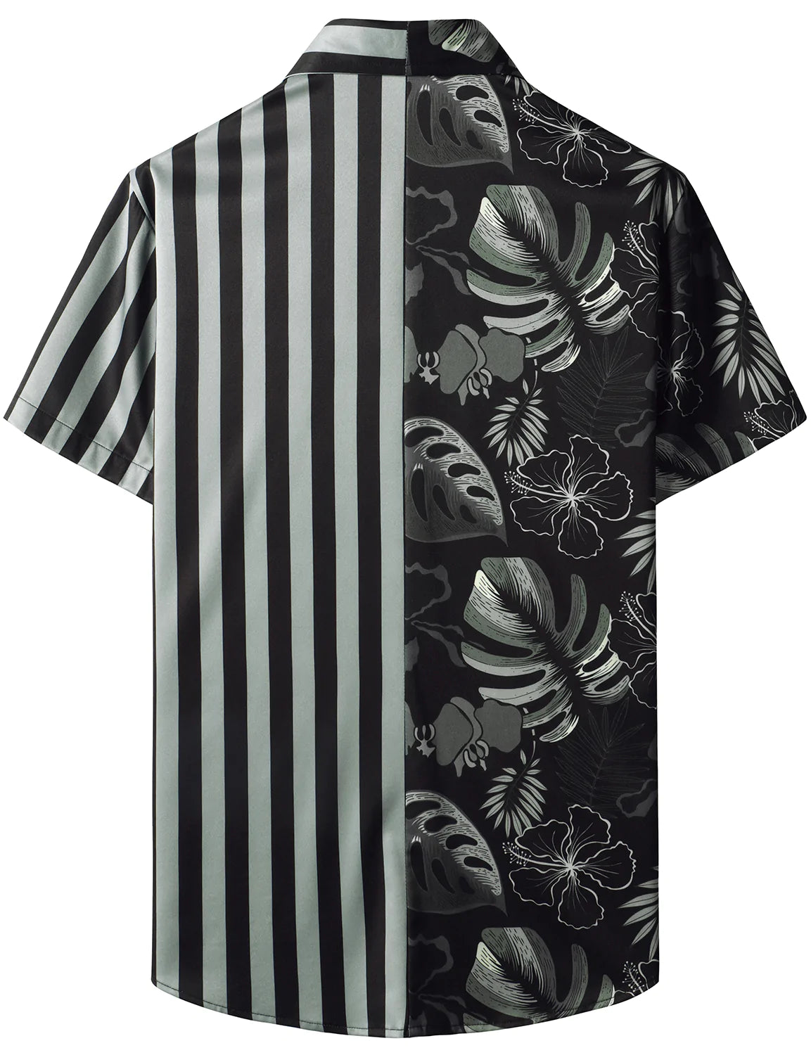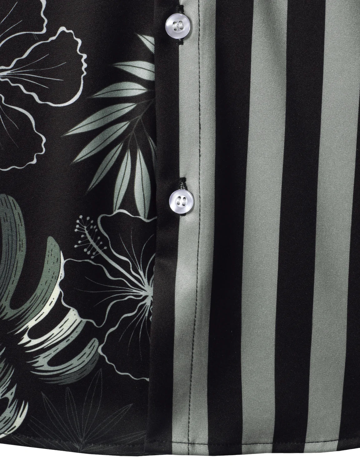Men's Black Striped & Floral Print Short Sleeve Casual Hawaiian Vacation Beach Shirt