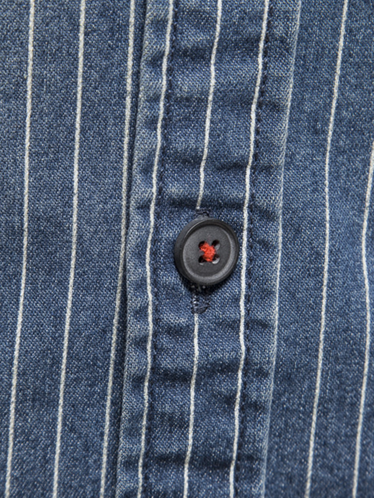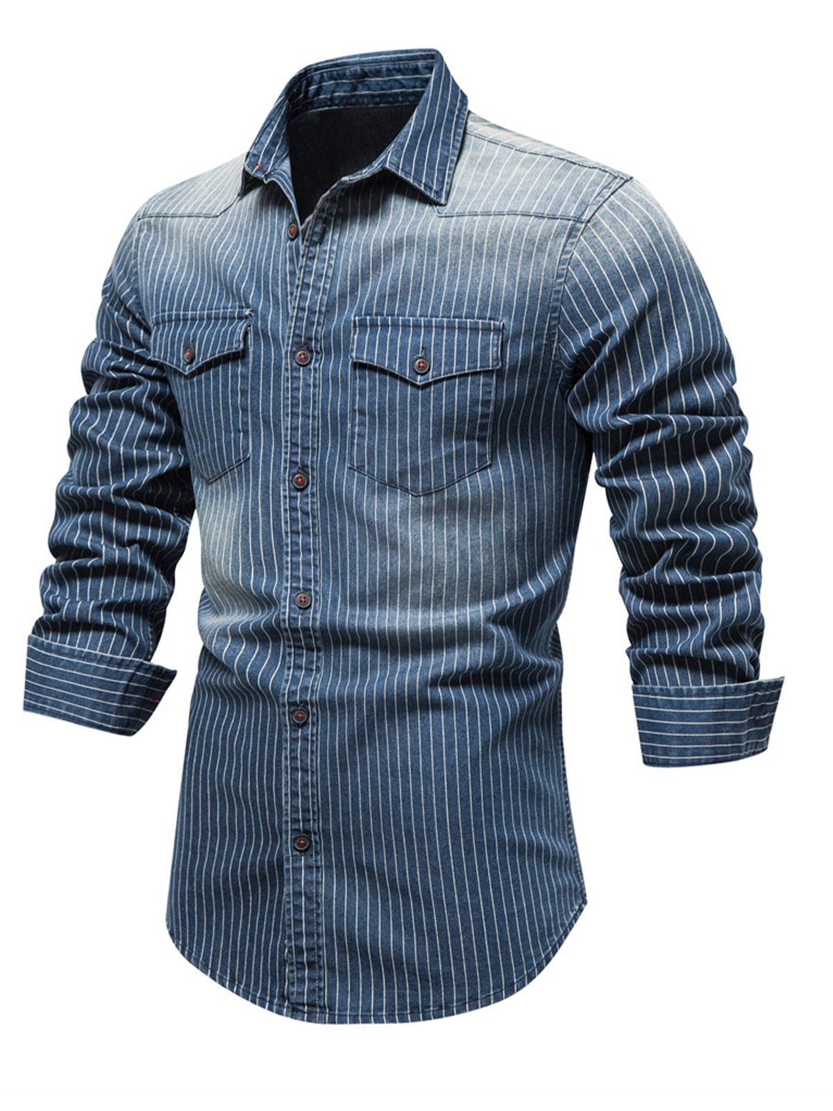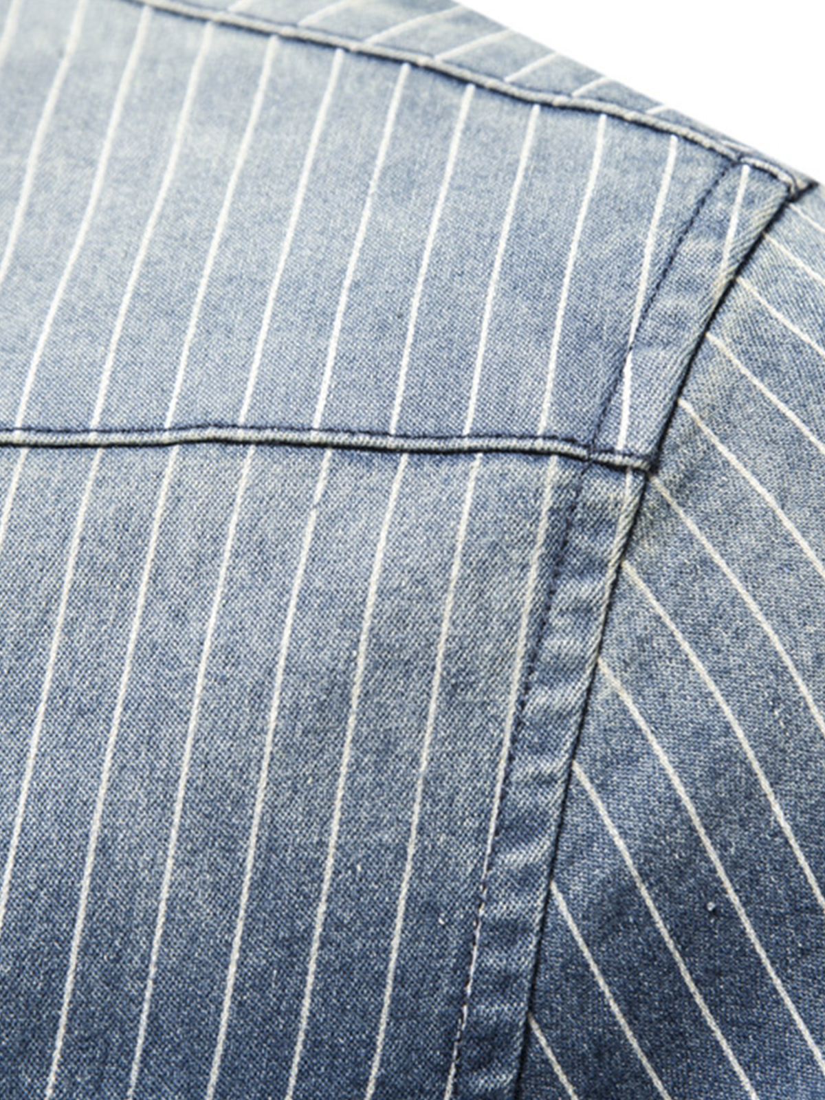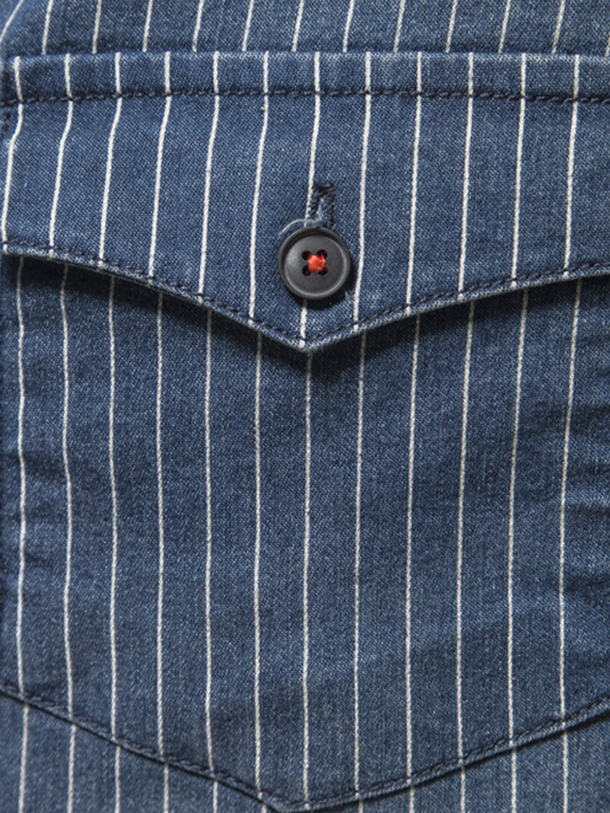 Men's Denim Striped Pocket Vintage Cotton Long Sleeve Button Shirt
