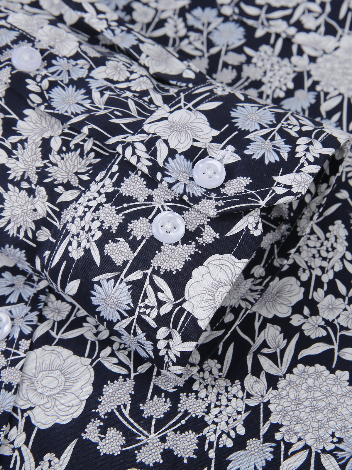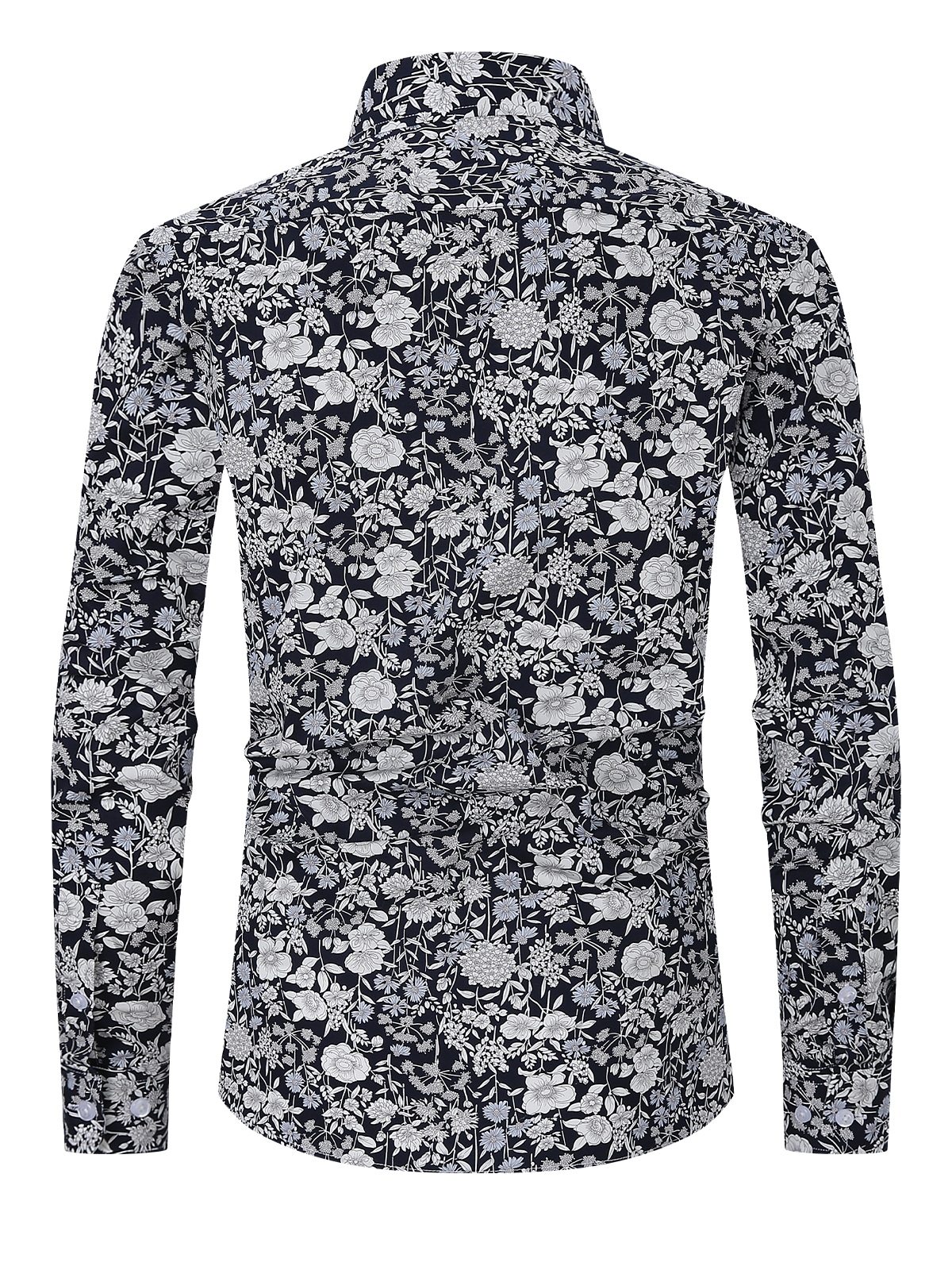 Men's Navy Blue Vintage Floral Cotton Breathable Flower Button Long Sleeve Dress Shirt