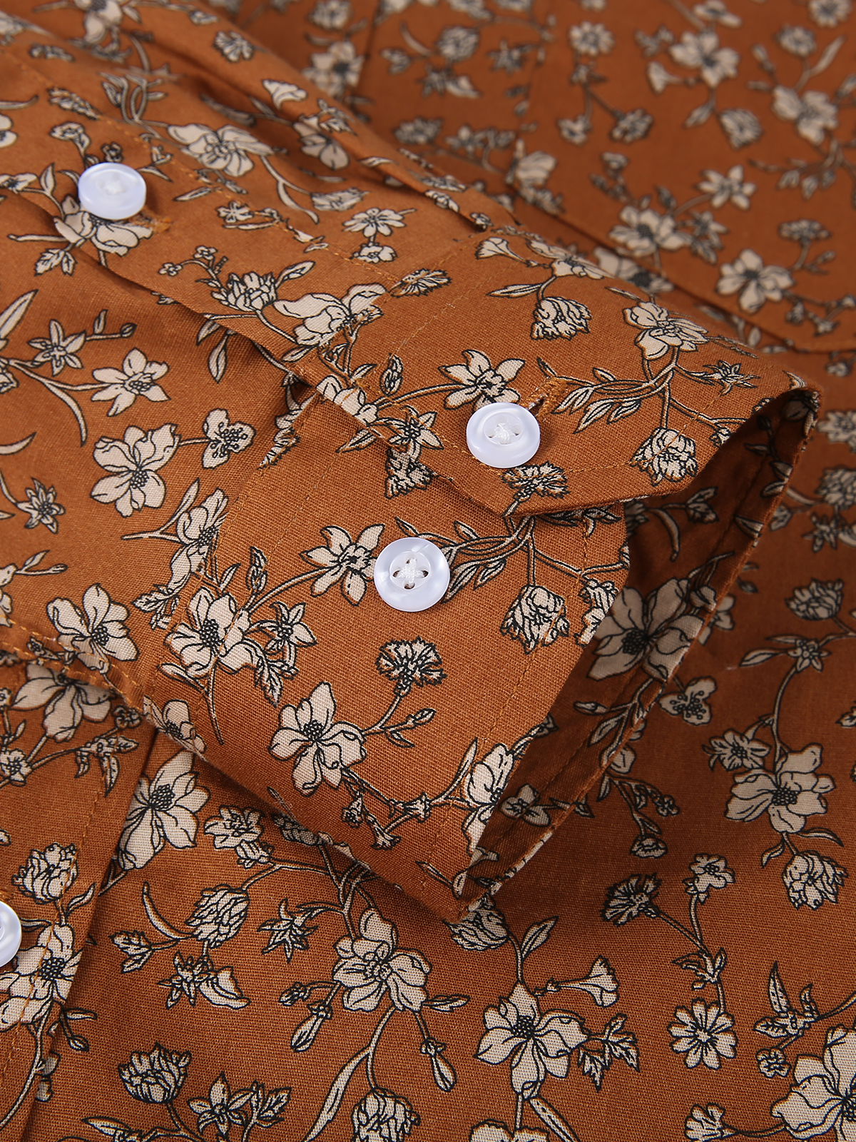 Men's Floral Print Button Up Brown Vintage Long Sleeve Dress Shirt