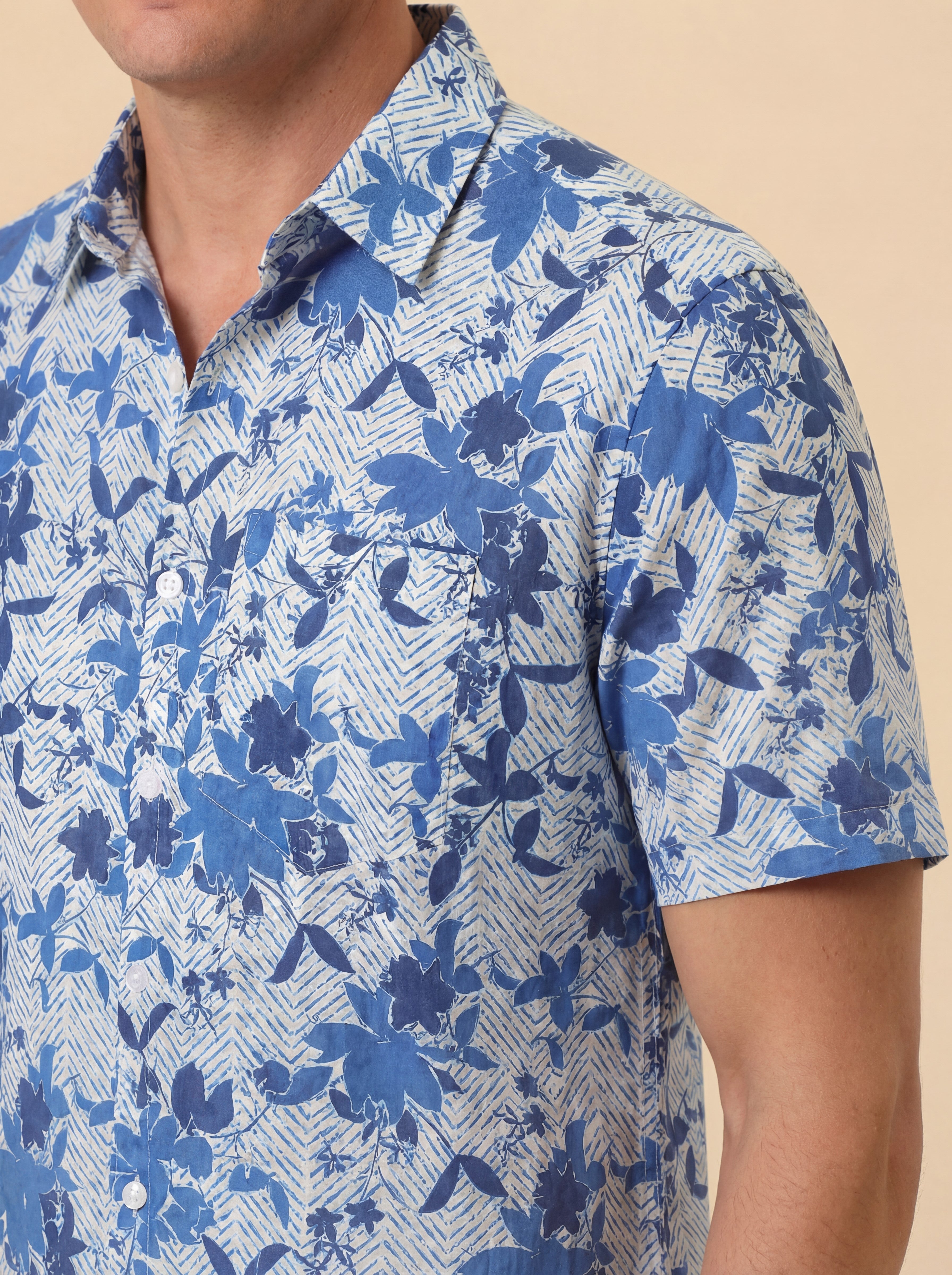 Men's Tropical Blue Floral Button Up Short Sleeve Shirt