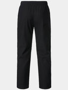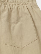 - Flat-front casual pants featuring slanted side pockets and rear pockets, mid-rise fit, elastic waistband, and adjustable drawstring closure.