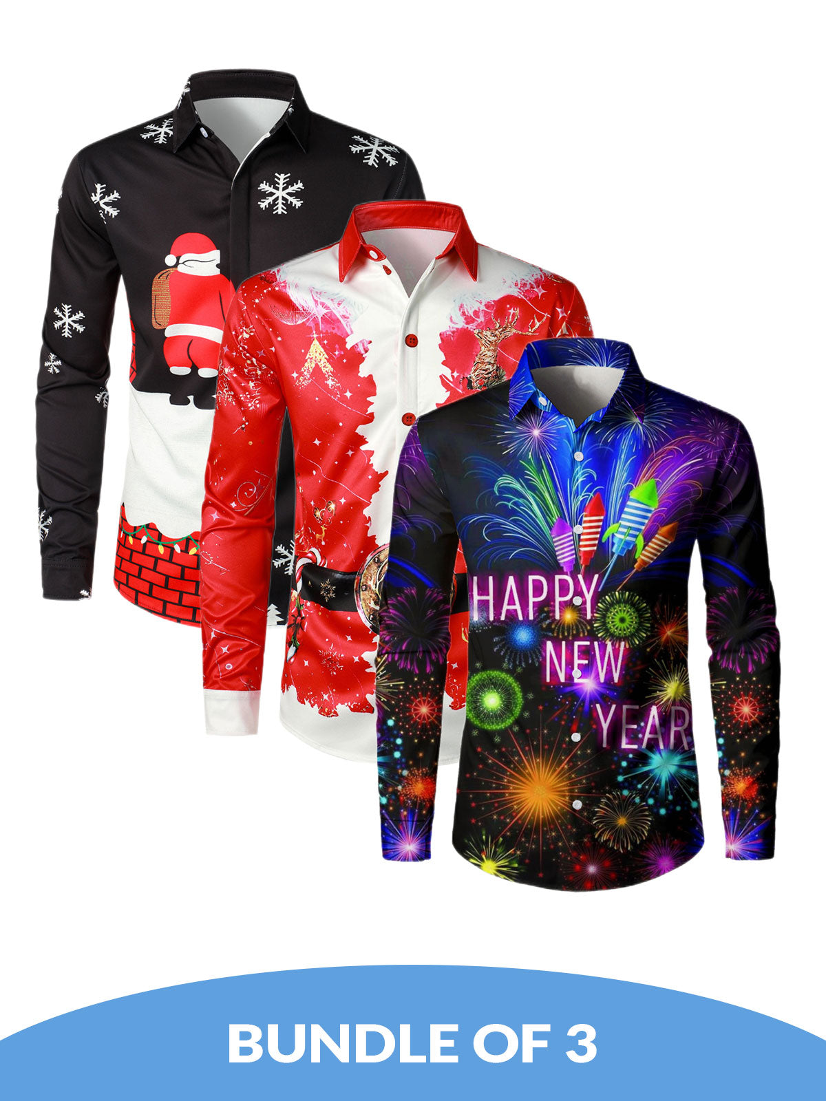 Bundle Of 3 | Men's Christmas Santa Xmas Happy New Year Fireworks Long Sleeve Shirt