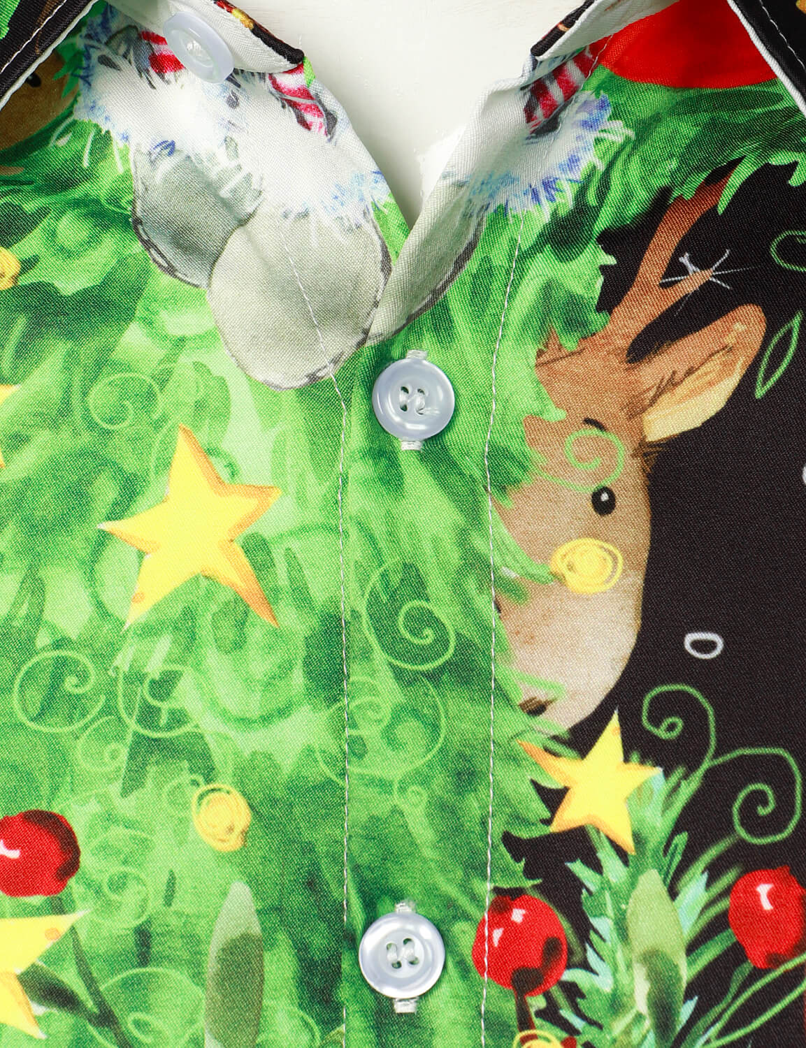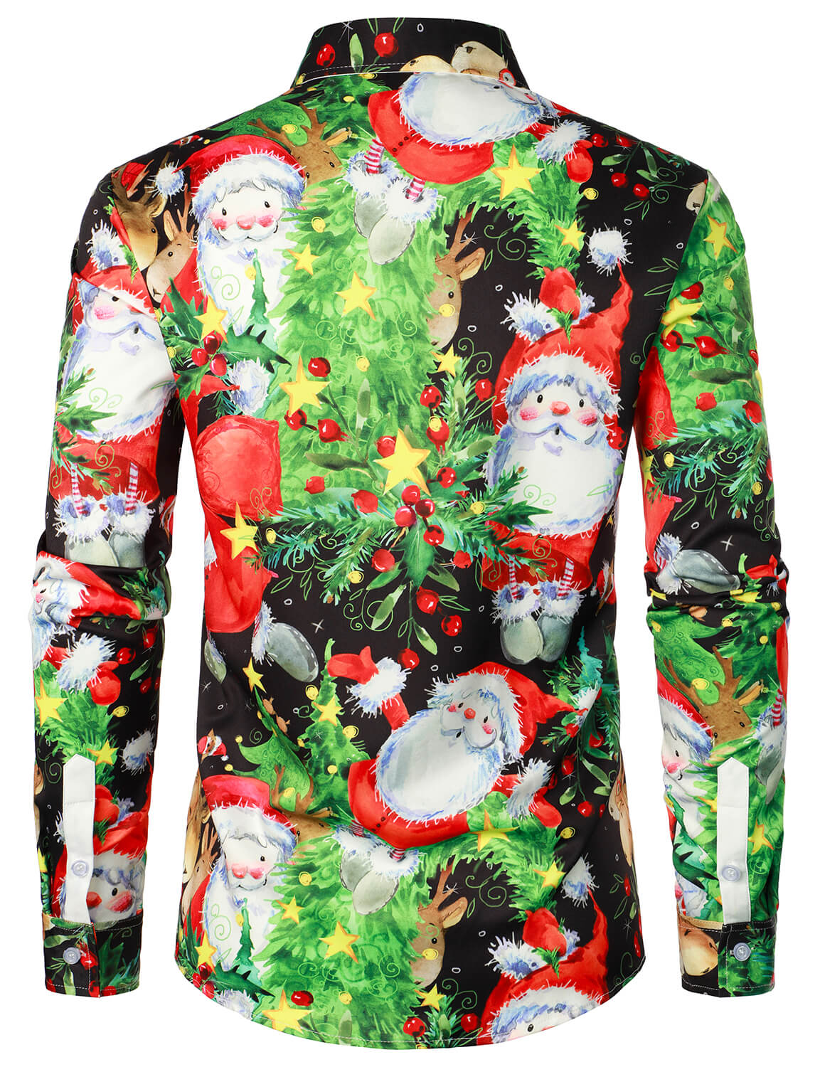 Men's Vintage Santa Reindeer Elk Christmas Tree Holiday Party Long Sleeve Button Up Shirt