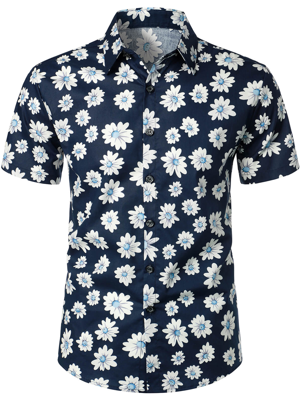 Men's Flower Print Cotton Hawaiian Floral Button Short Sleeve Shirt