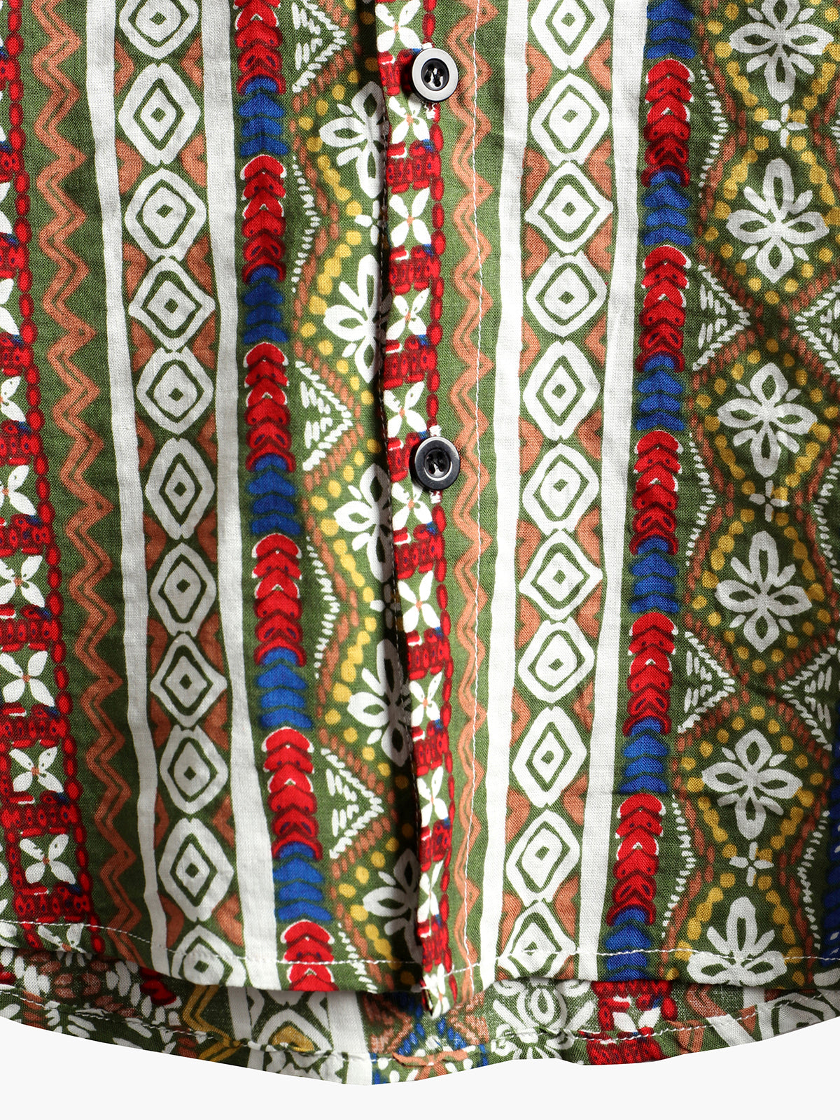 Men's Cotton Vintage 70s Floral Retro Button Up Green Summer Beach Bohemian Boho Short Sleeve Shirt