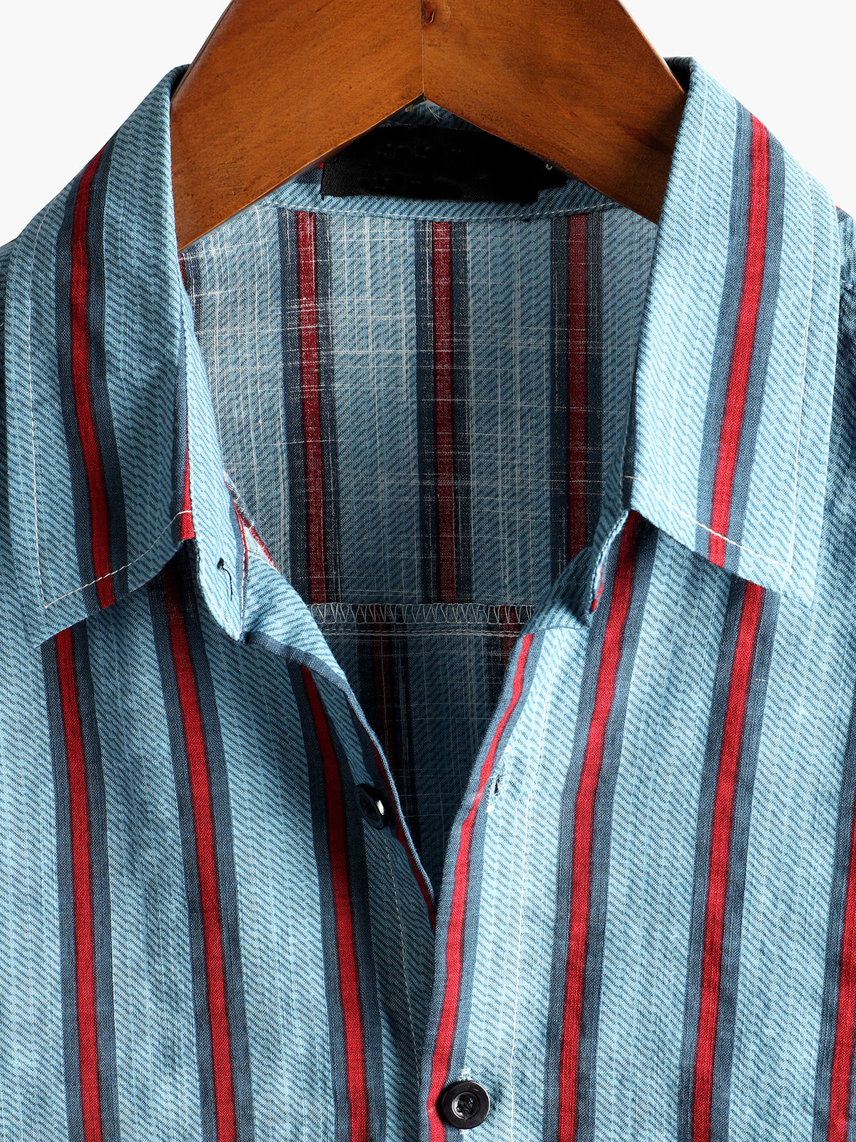 Men's Blue Striped Casual Cotton Short Sleeve Button Up Shirt