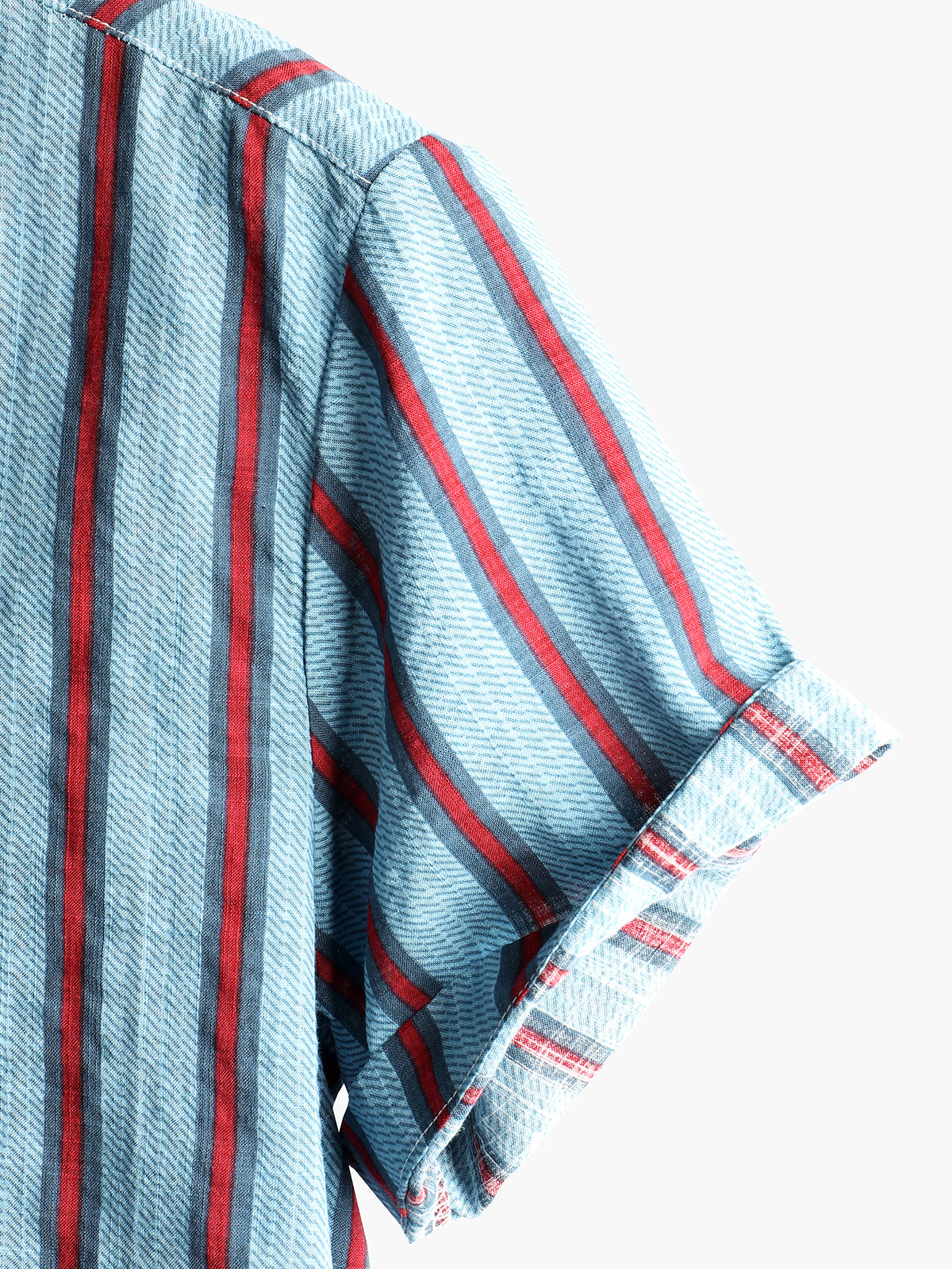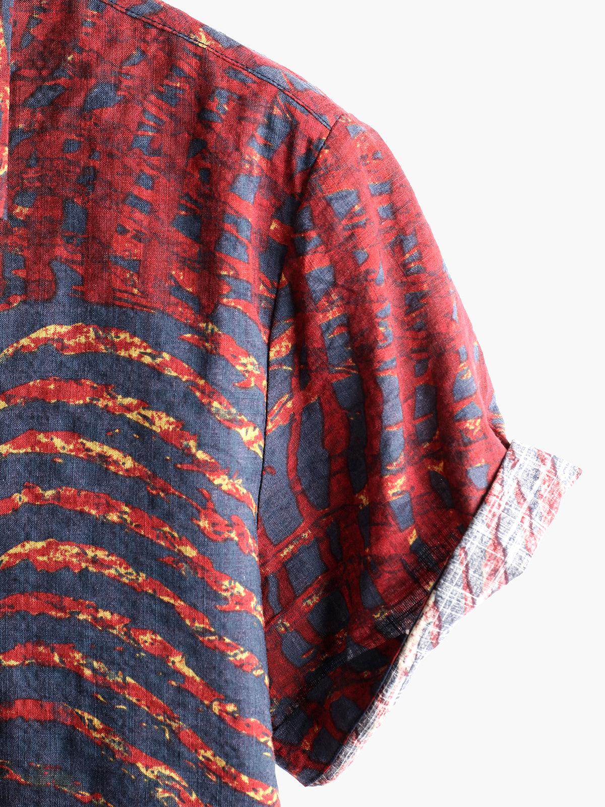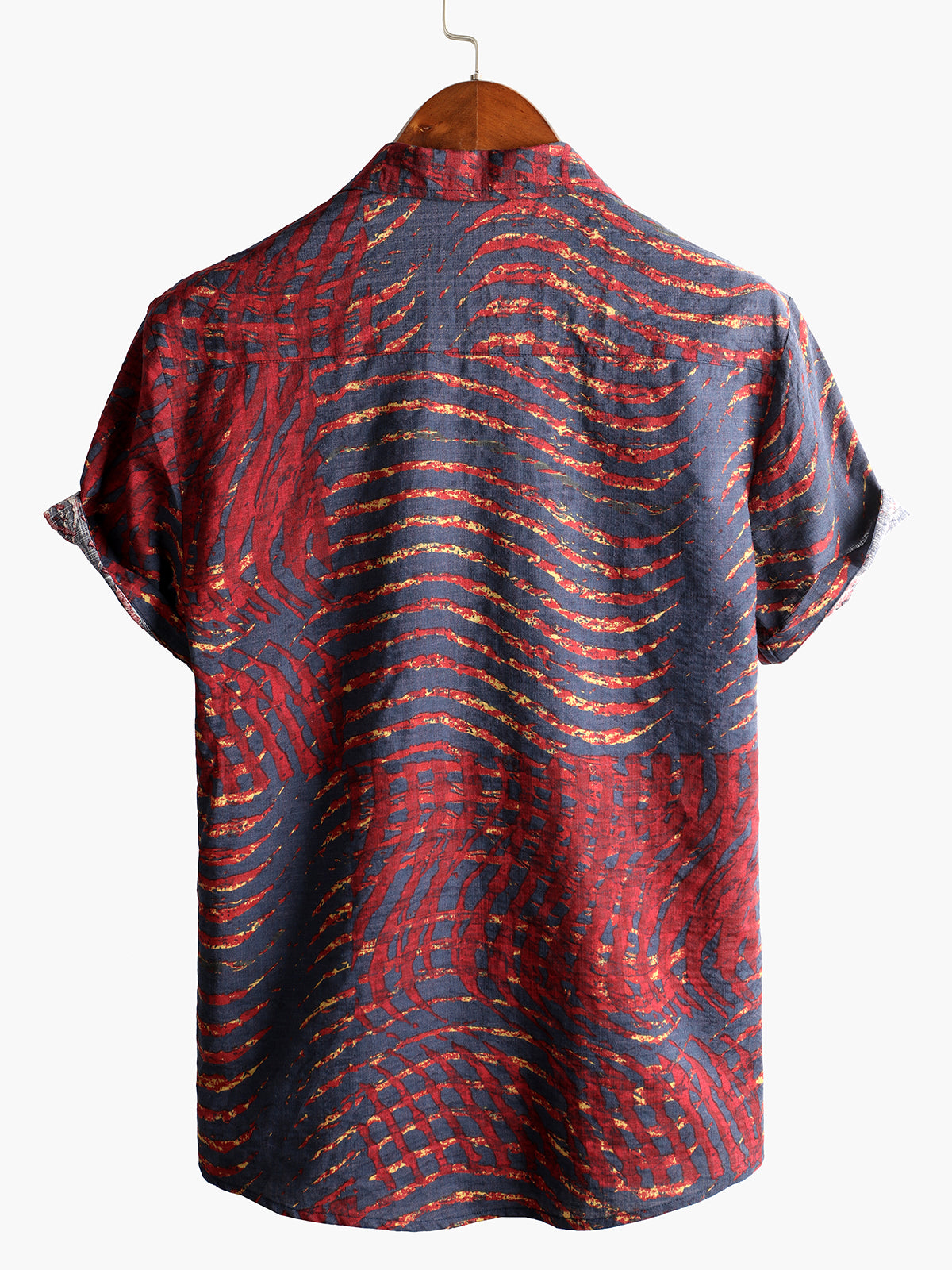 Men's Cotton Striped Stand Collar Short Sleeve Shirt