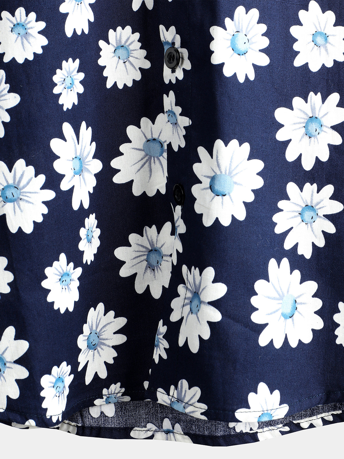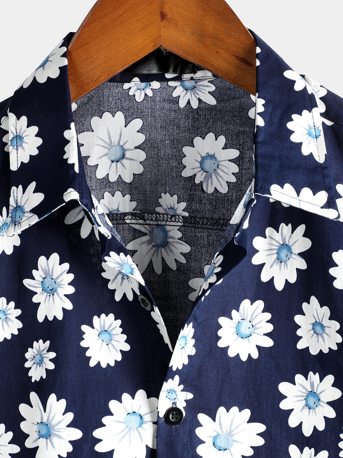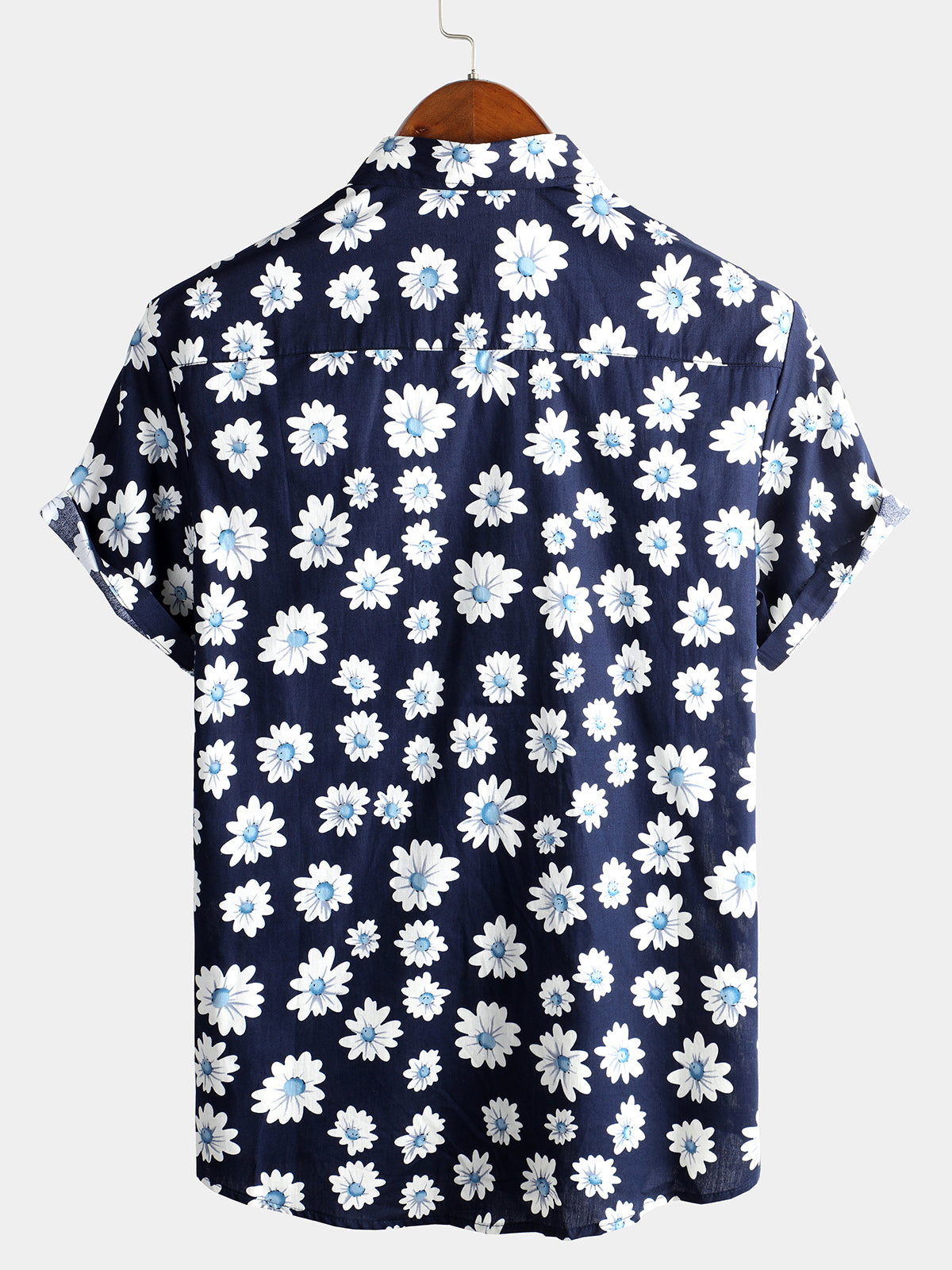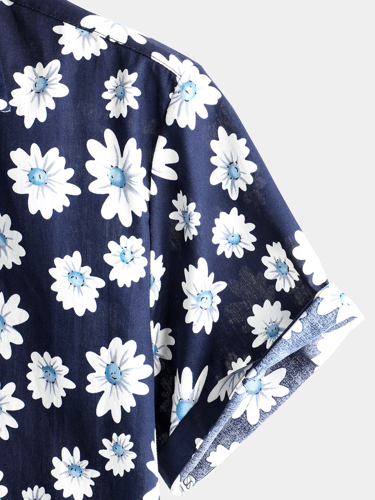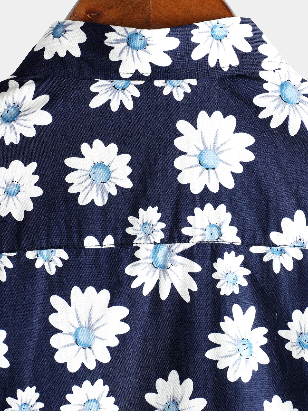 Men's Blue Daisy Floral Summer Button Up Hawaiian Short Sleeve Shirt