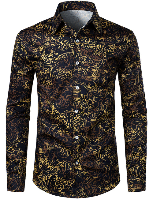 Men's Vintage Paisley Floral Casual Long Sleeve Cotton Regular Fit Black Dress Shirt