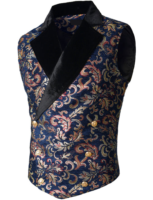 Men's Victorian Waistcoat Double Breasted Floral Paisley Gothic Steampunk Navy Blue Waistcoat
