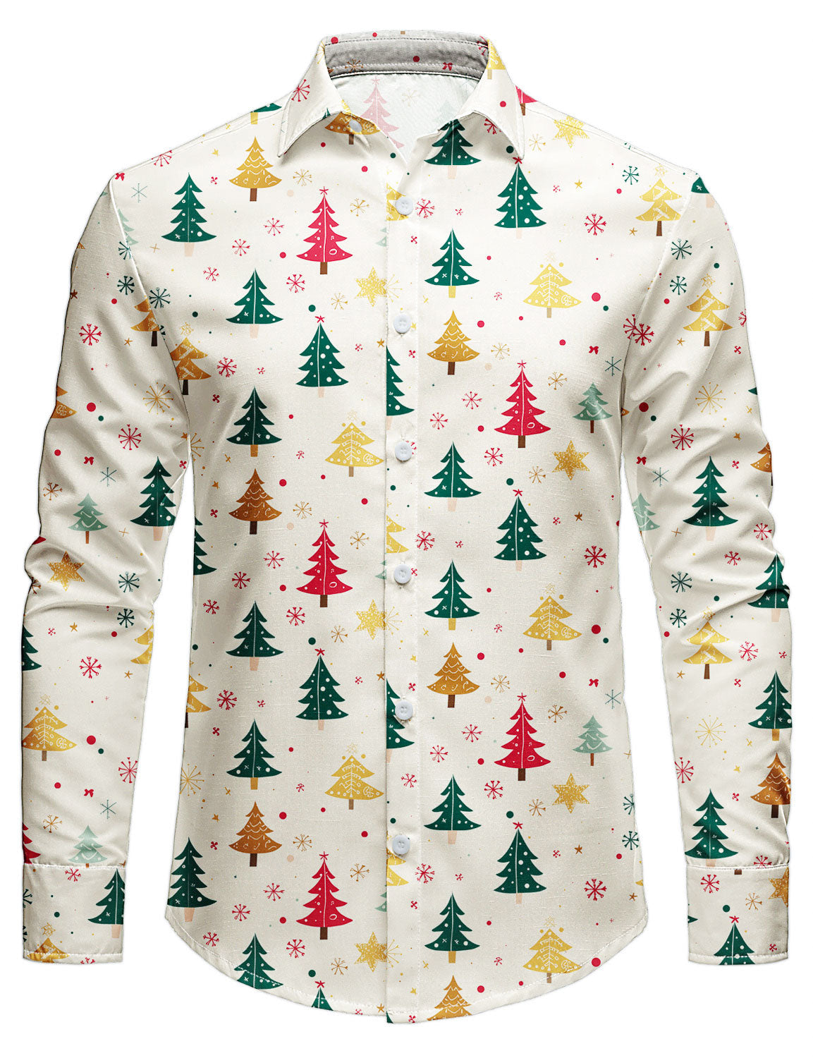 Men's Vintage Christmas Tree Printed Holiday Long Sleeve Shirt