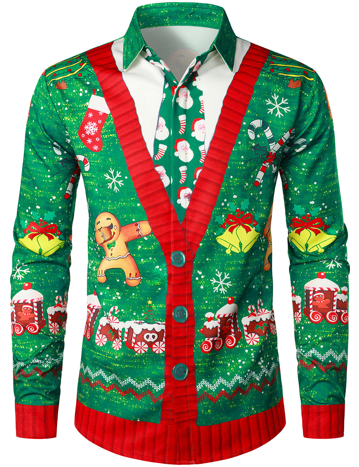 Men's Christmas Crackers Bell Print Funny Outfit Themed Top Long Sleeve Shirt
