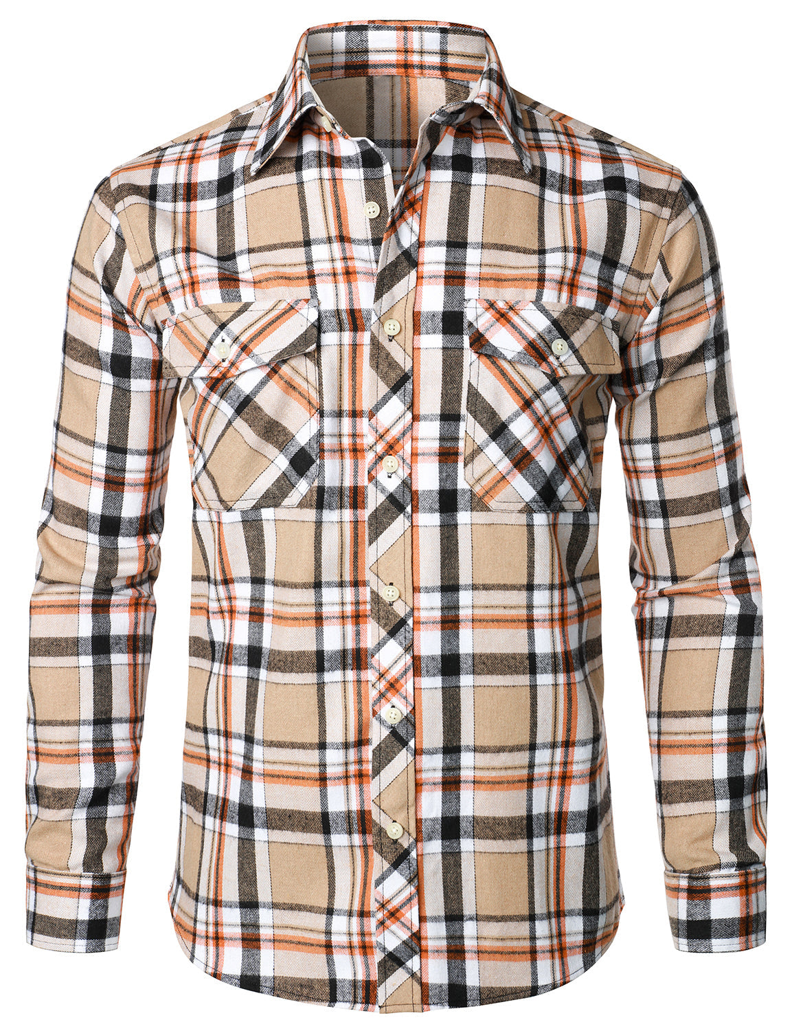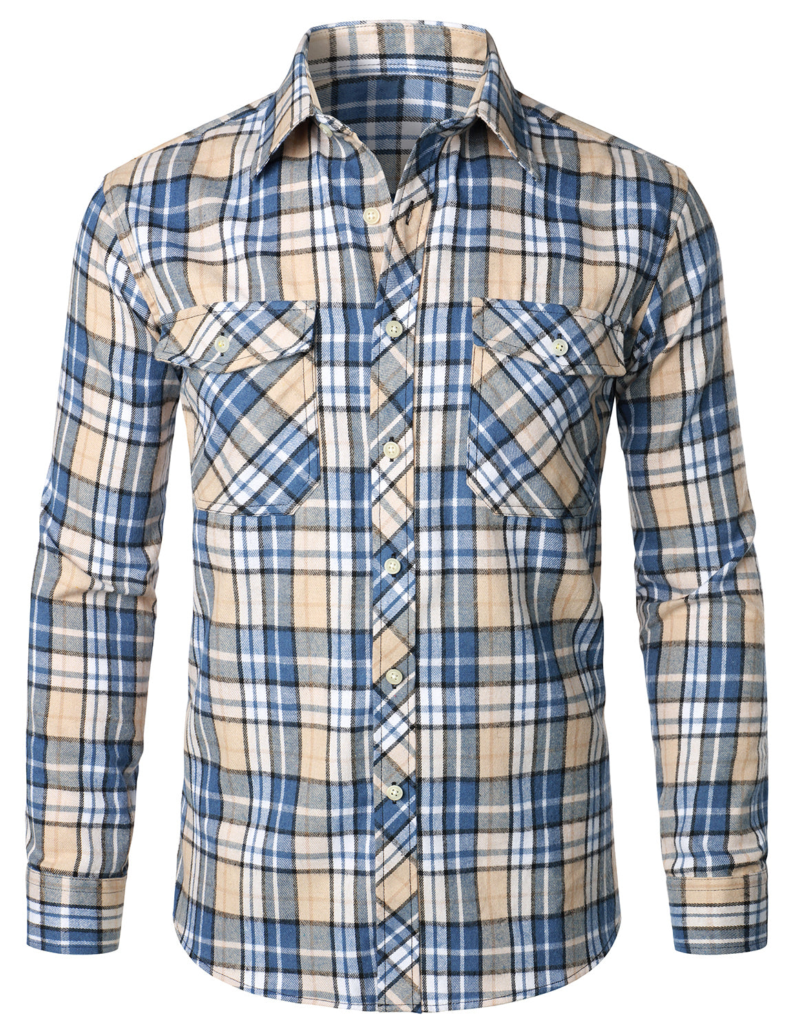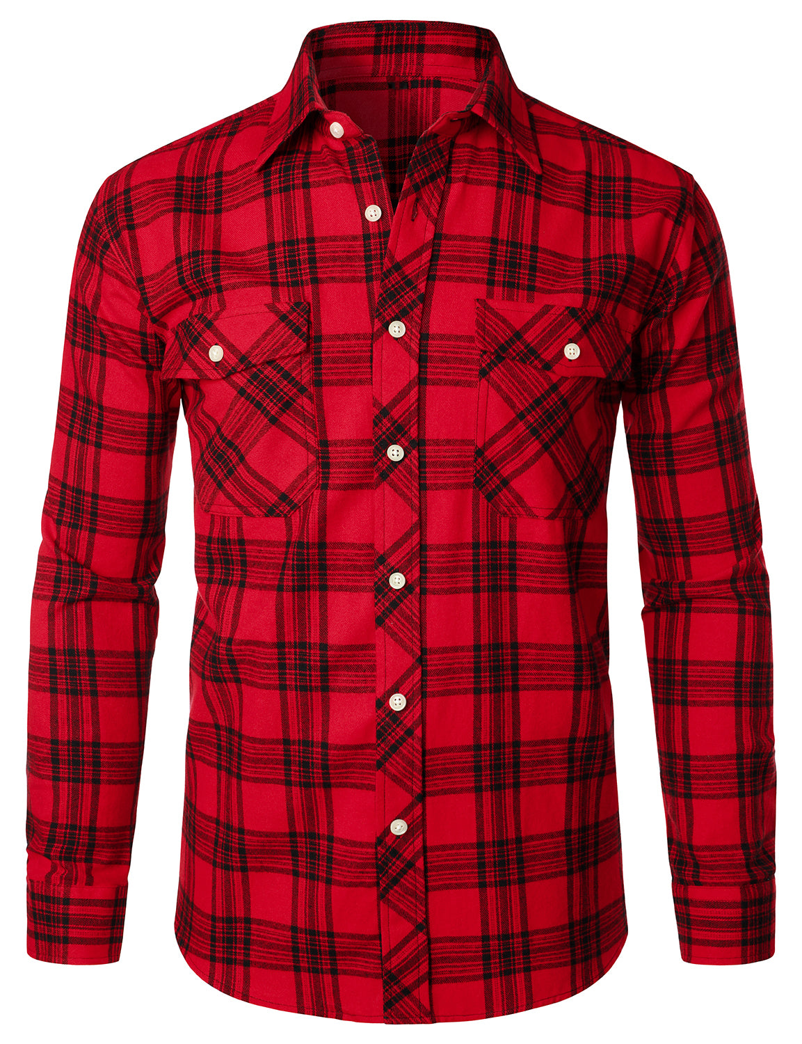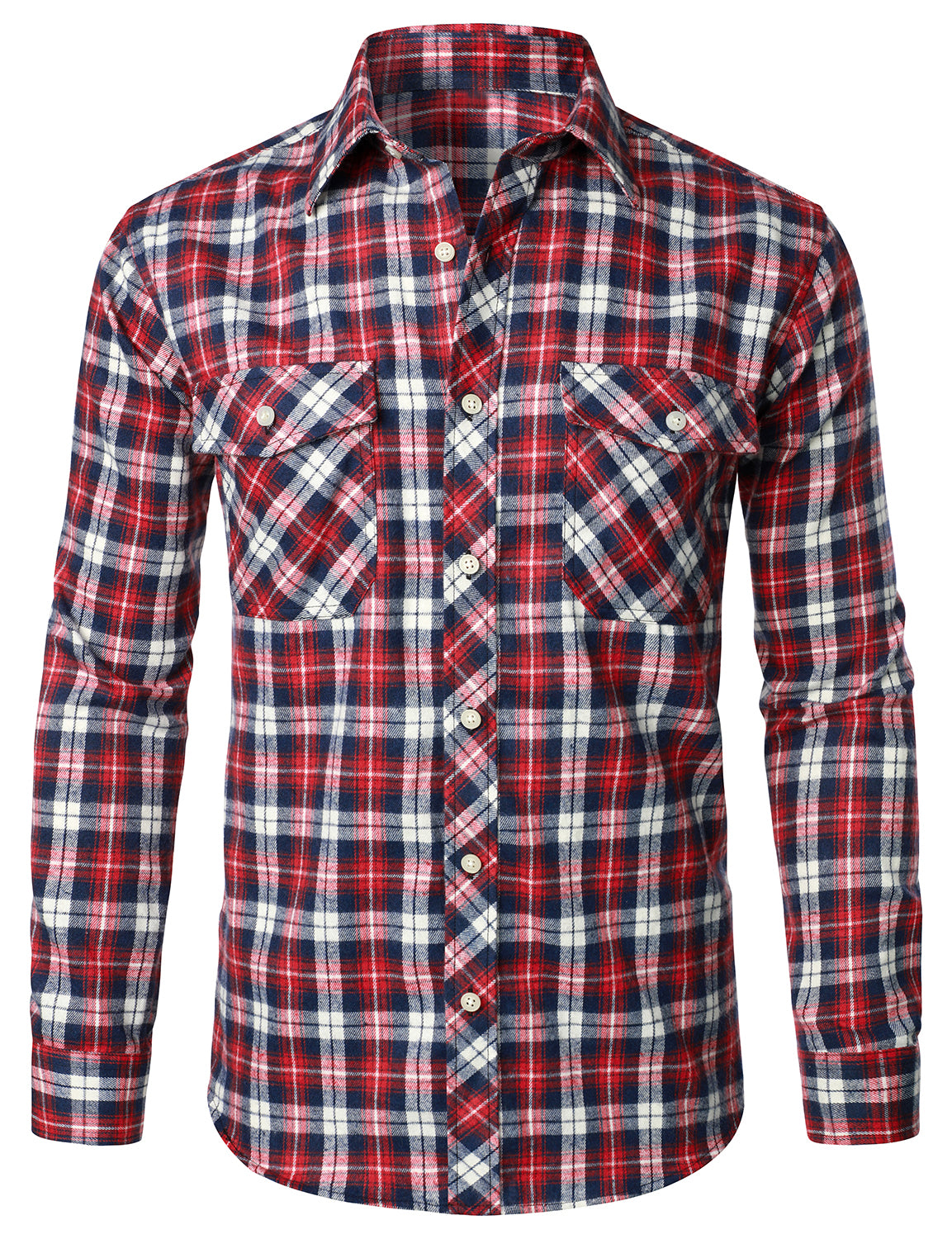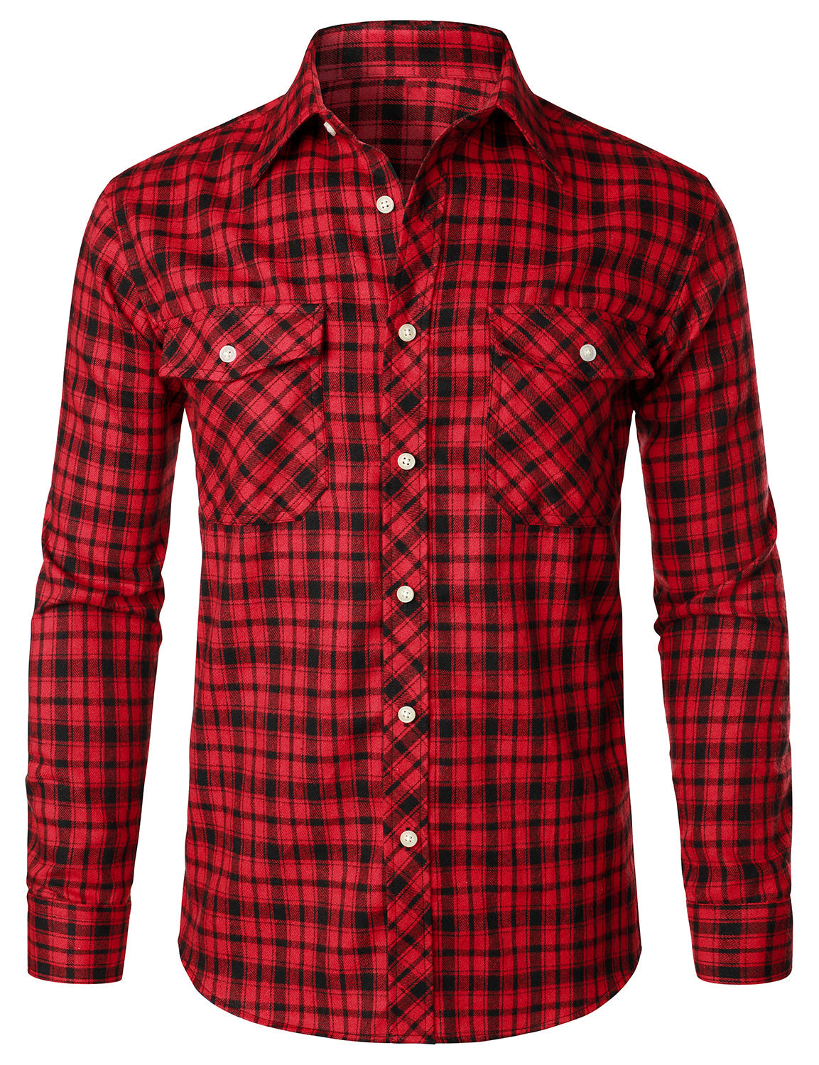 Men's Flannel Double Pocket Checkered Button Up Long Sleeve Casual Plaid Shirt