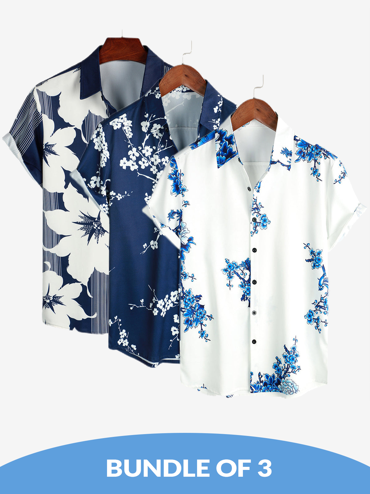 Bundle Of 3 | Men's Flower Print Vacation Hawaiian Vintage Aloha Short Sleeve Shirt