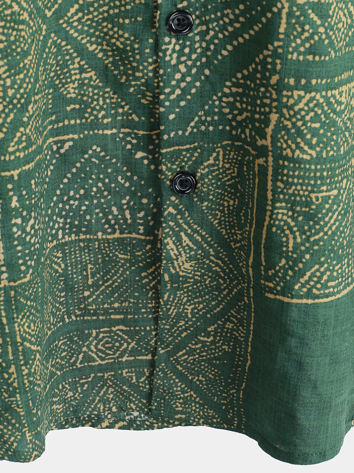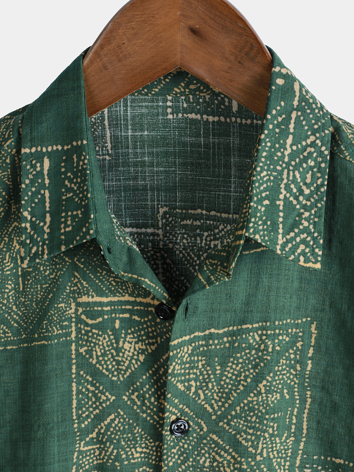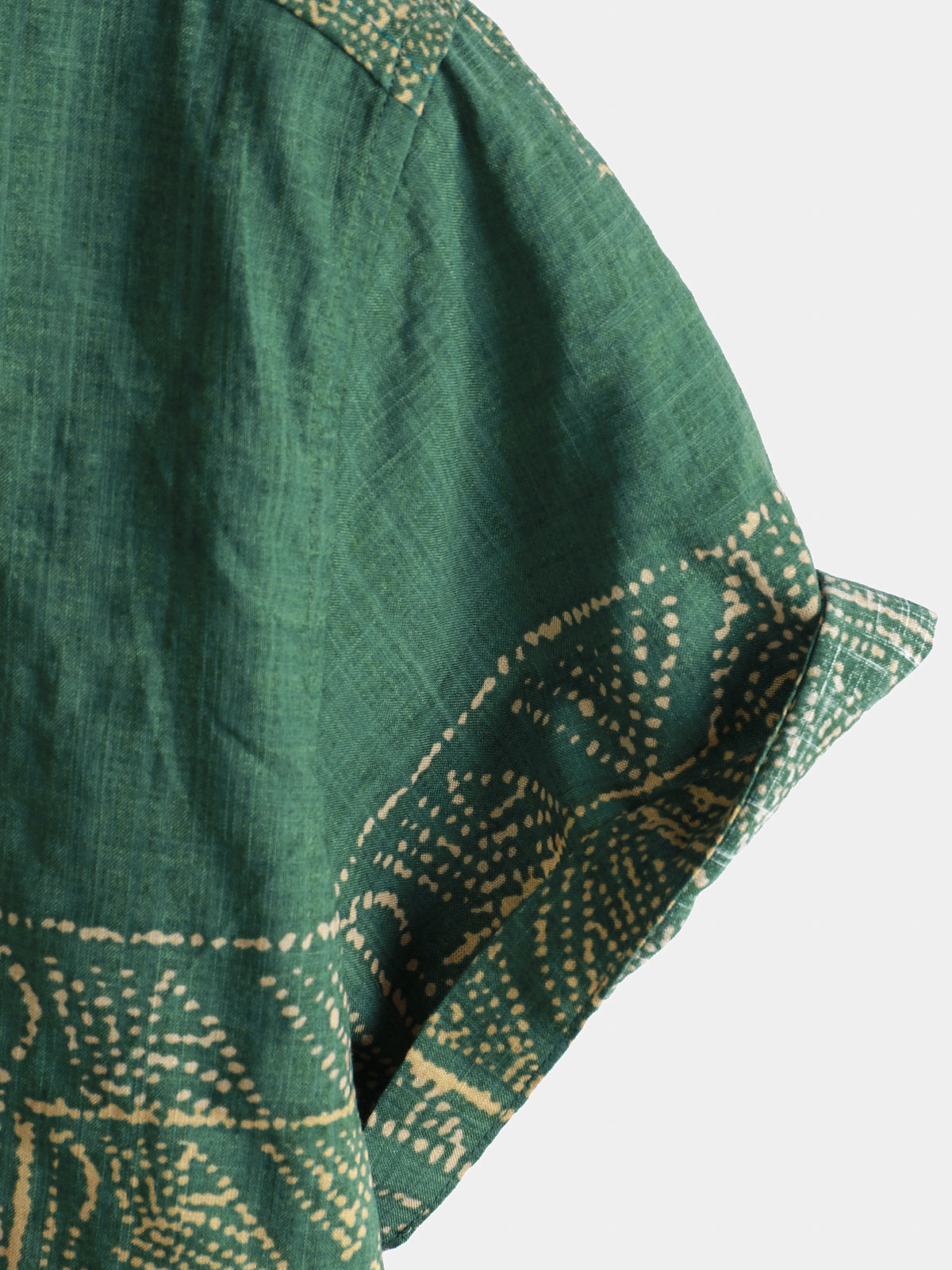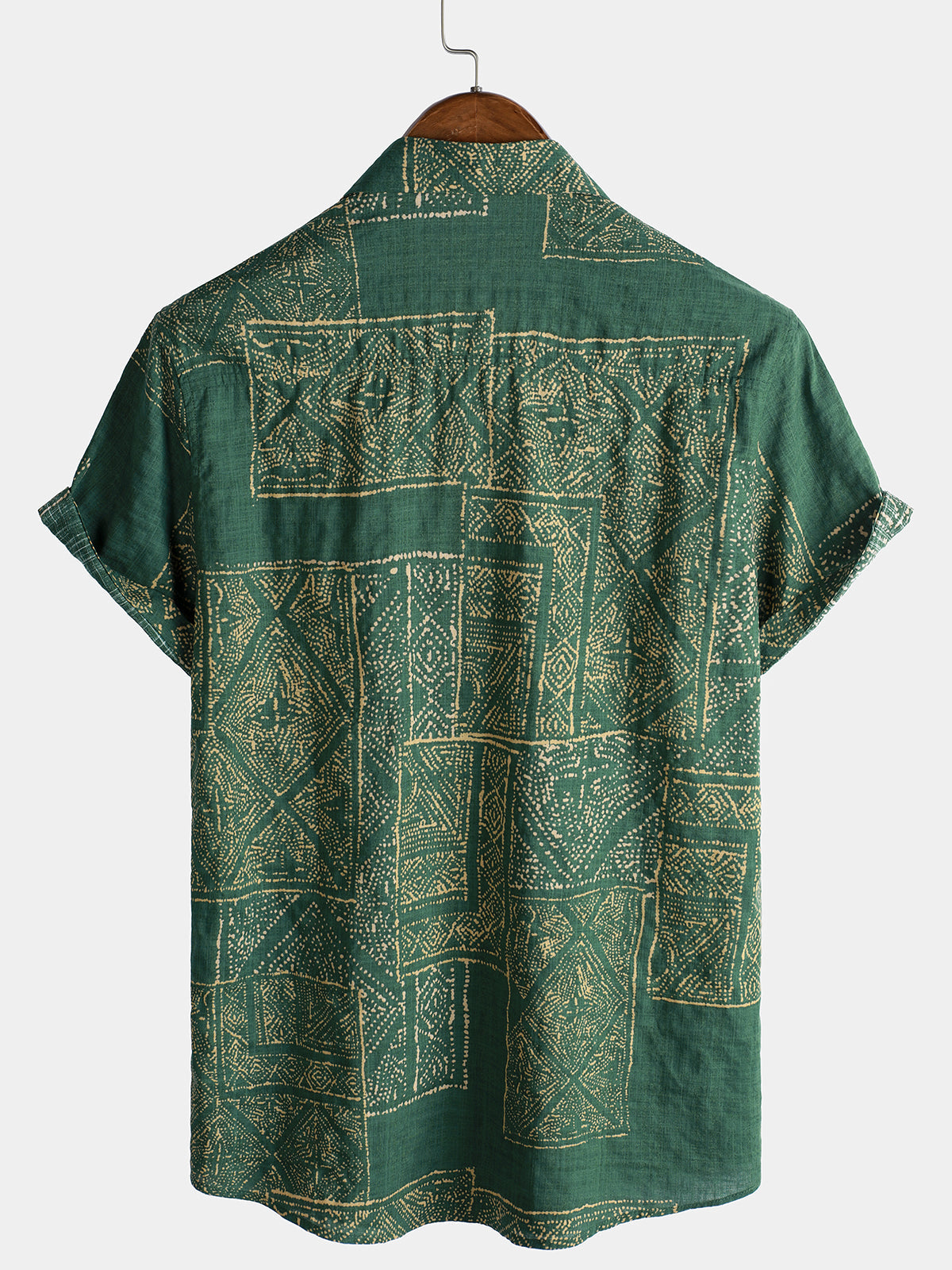 Men's Green Vintage Print Breathable Cotton Short Sleeve Shirt