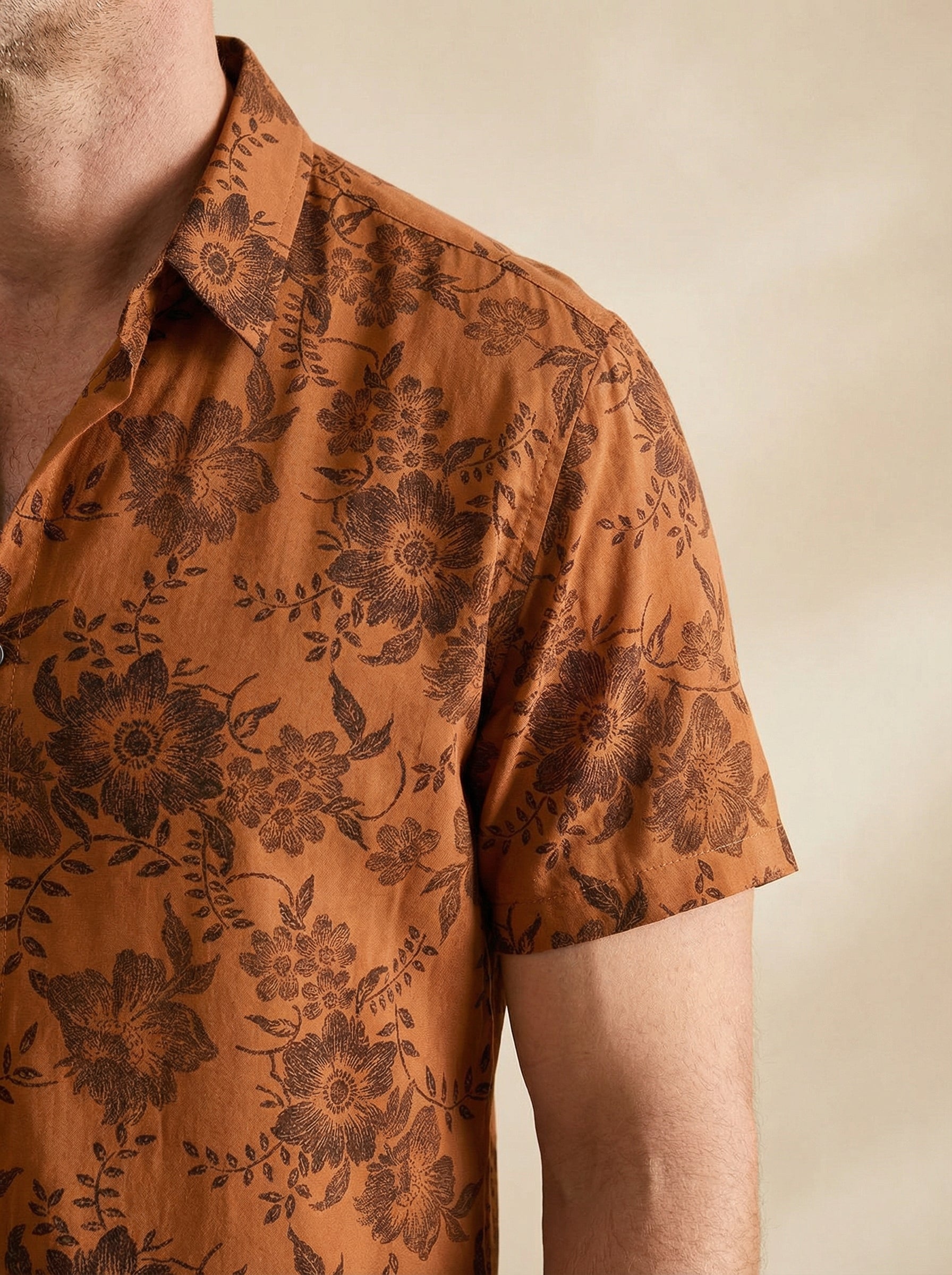 Camisa con botones de manga corta transpirable para vacaciones con flores vintage y estampado floral marrón para hombre