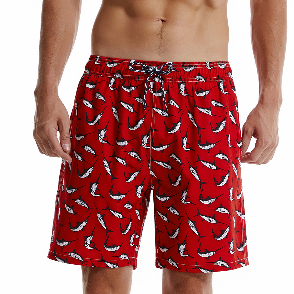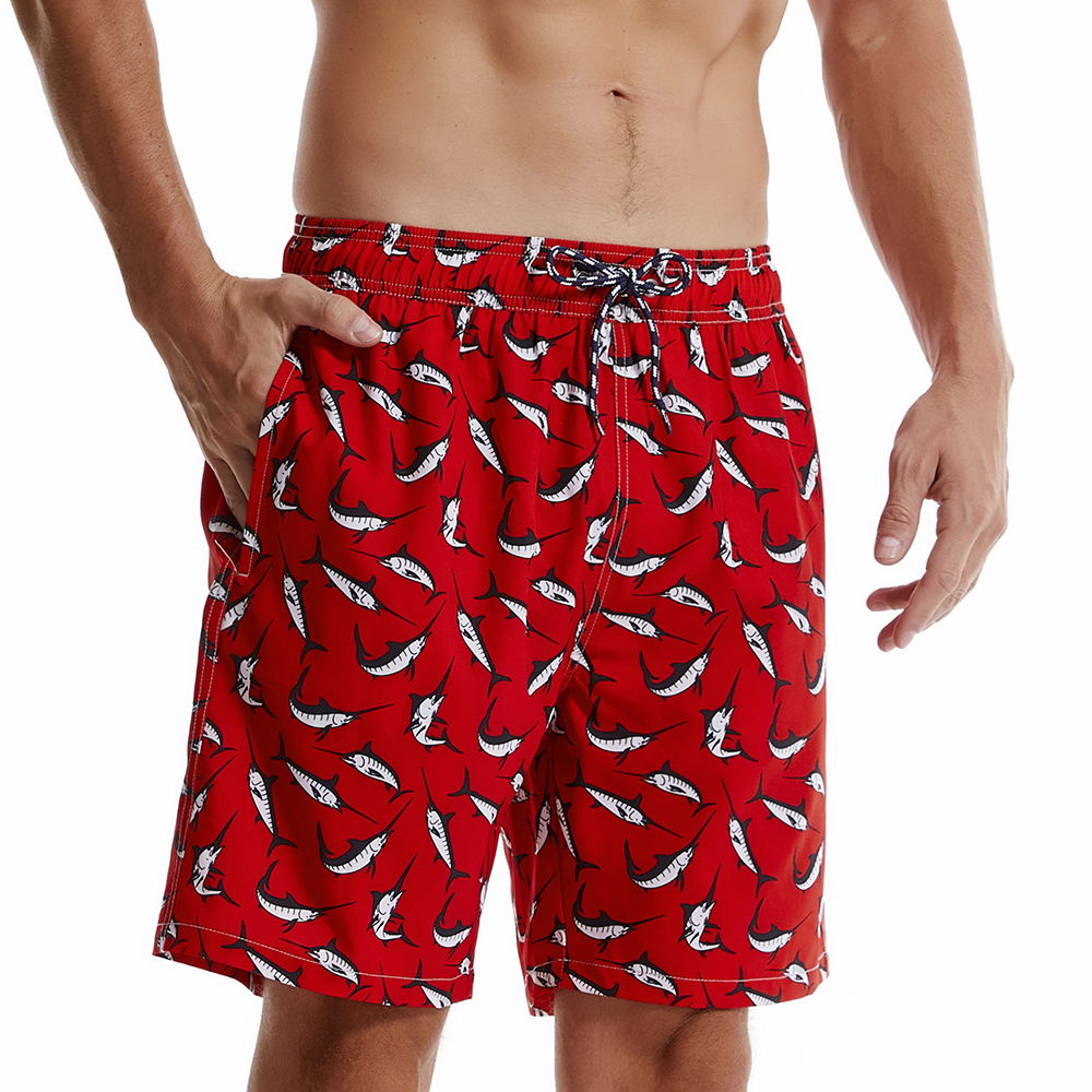 Men's Shark Print Red Quick Dry Beach Shorts Swim Trunks