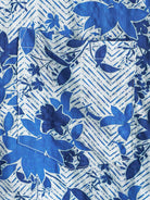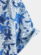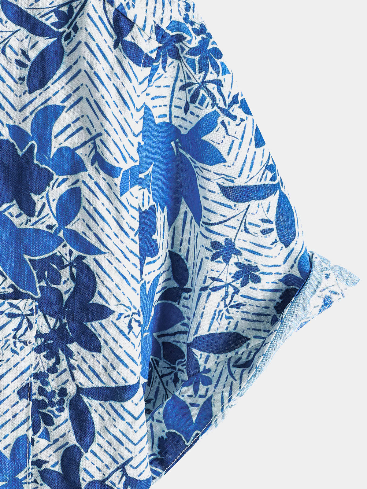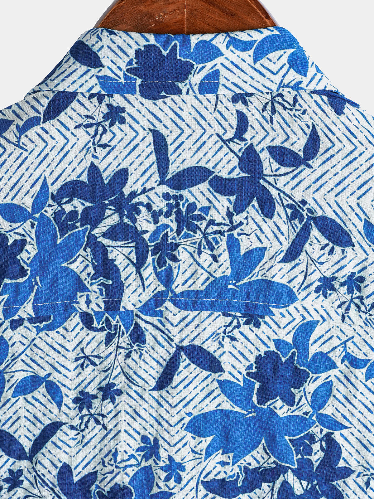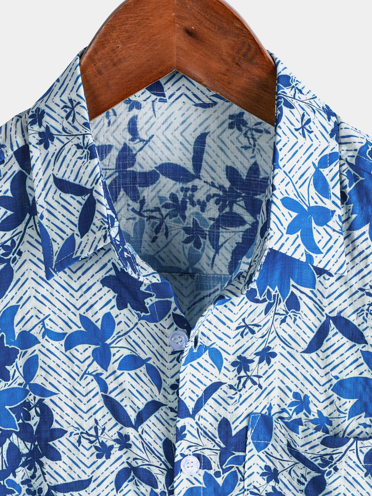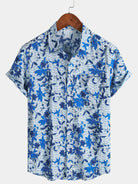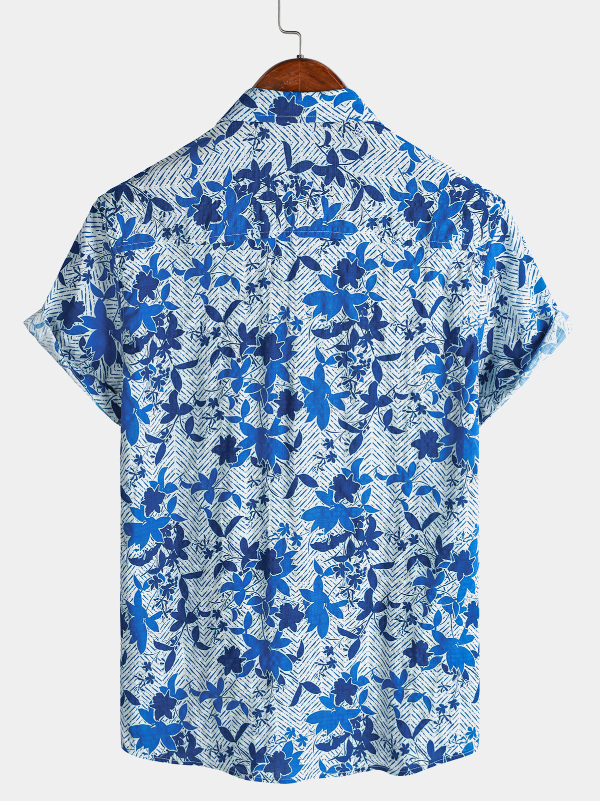 Men's Hawaiian Beach Blue Floral Print Breathable Lightweight Chest Pocket Short Sleeve Shirt