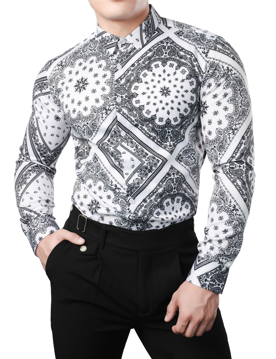 Men's Casual Paisley Print Floral Vintage Long Sleeve Dress Shirt