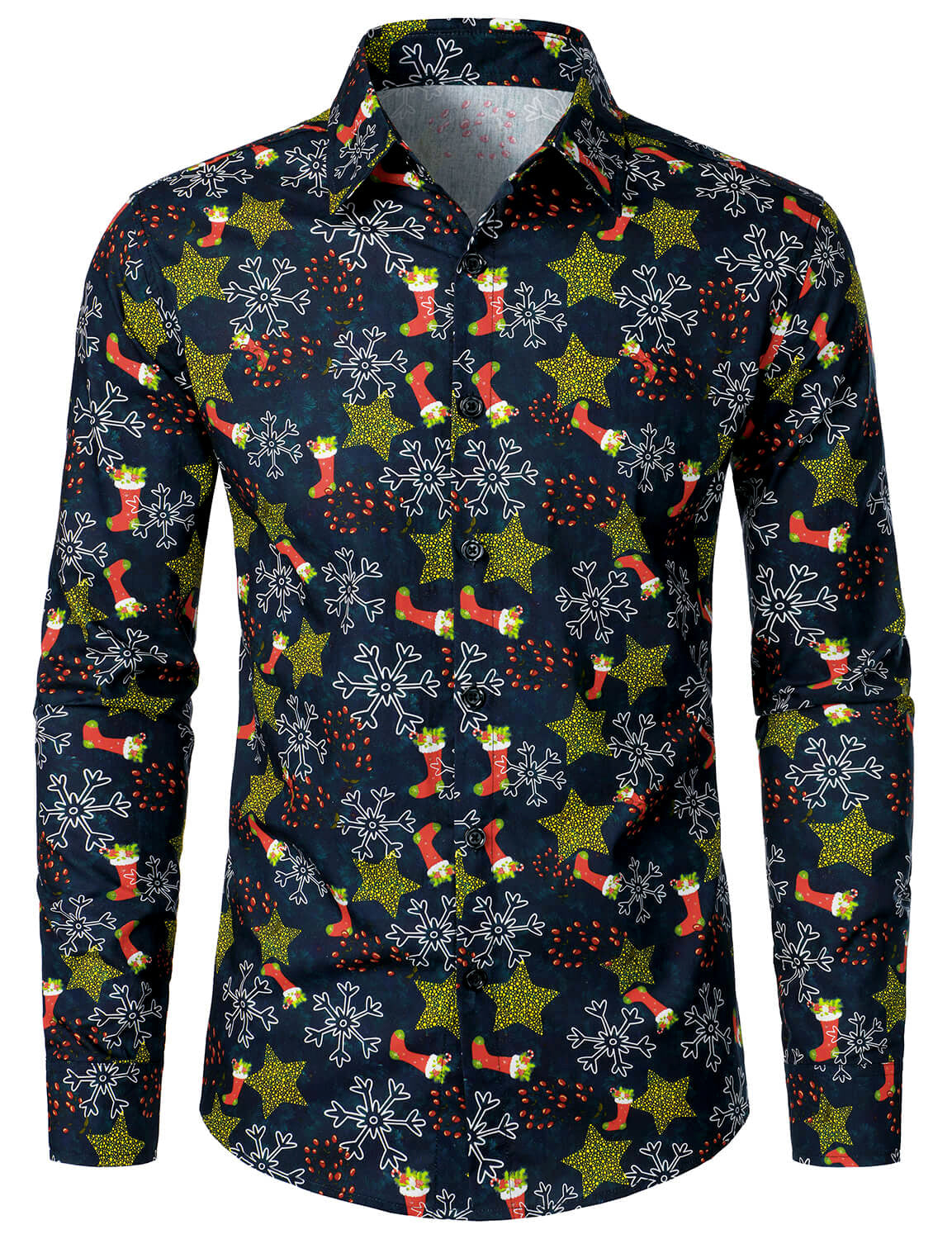Men's Christmas Print Holiday Cotton Long Sleeve Shirt