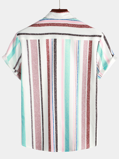 Men's Summer Striped Pocket Button Up Short Sleeve Vintage Beach Hawaiian Shirt