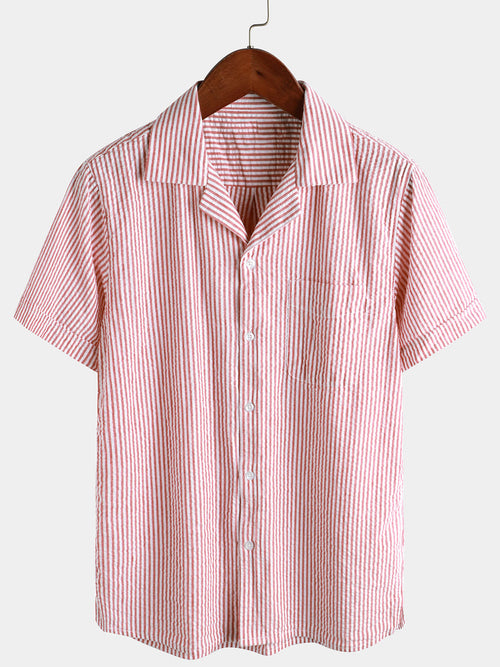 Men's Breathable Striped Cotton Button Up Summer Cuban Collar Camp Short Sleeve Beach Shirt