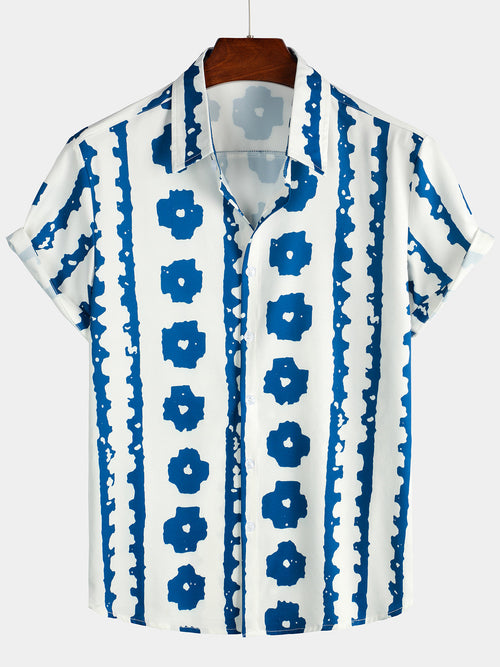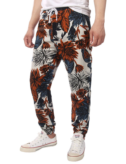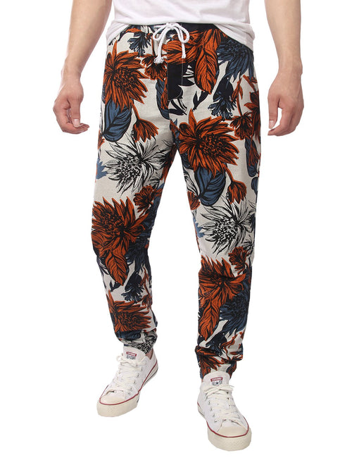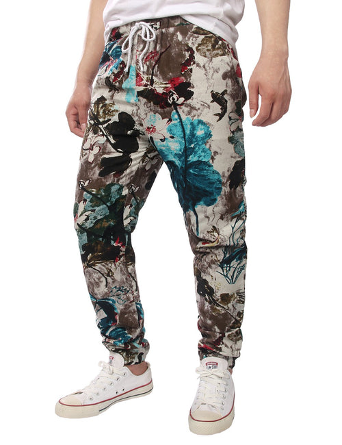 Men's Jogger Cotton Pants Flower Printed Drawstring Trousers(Blue)