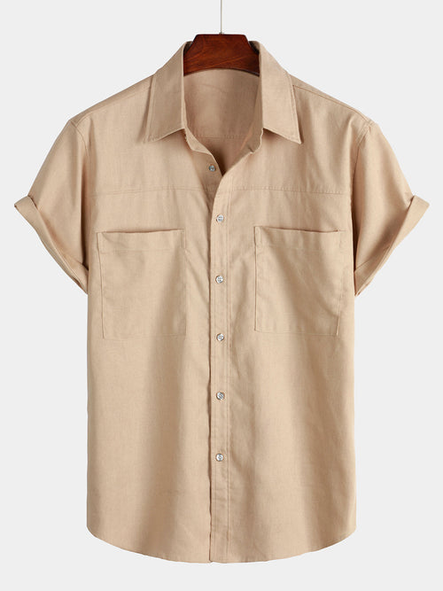 Men's Cotton & Linen Chest Pockets Solid Color Short Sleeve Shirt