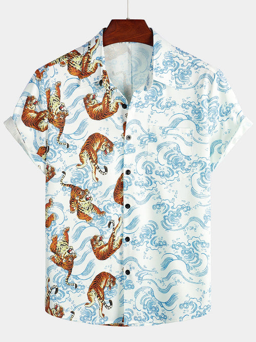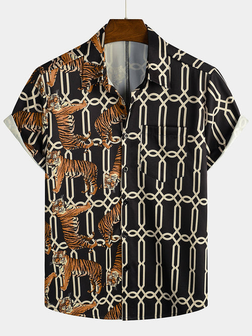 Men's Casual Tiger Print Pocket Short Sleeve Shirt