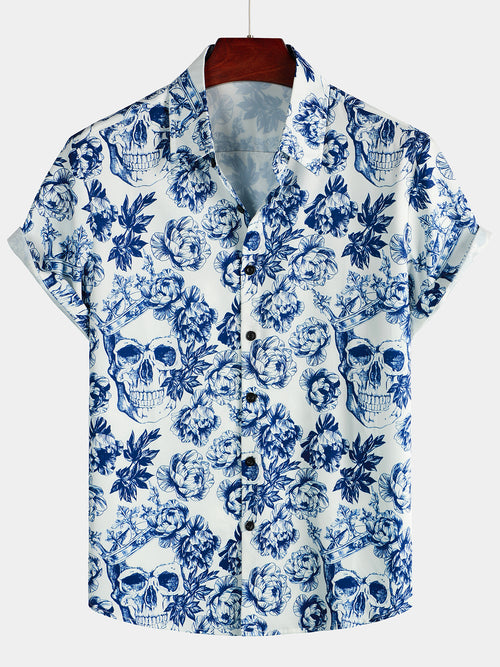 Men's Skull Floral Print Casual Lapel Button Short Sleeve Shirt