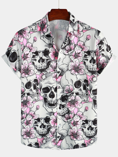 Men's Skull Pink Flowers Button Up Short Sleeve Shirts