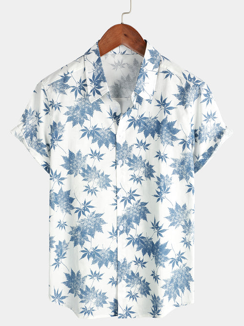 Men's Cotton Linen Maple Leaf Print Breathable Short Sleeve Shirt