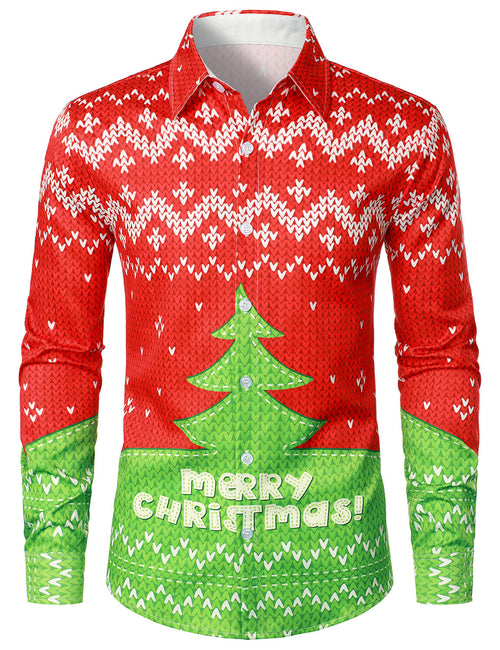 Men's Christmas Tree Gift Ornament Print Button Up Long Sleeve Shirt