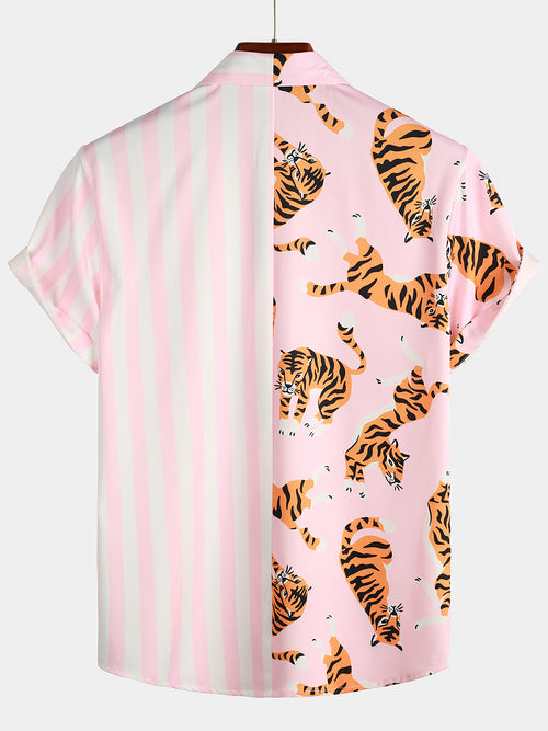 Men's Breathable Short Sleeve Pocket Pink Striped Shirt