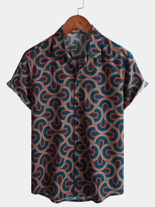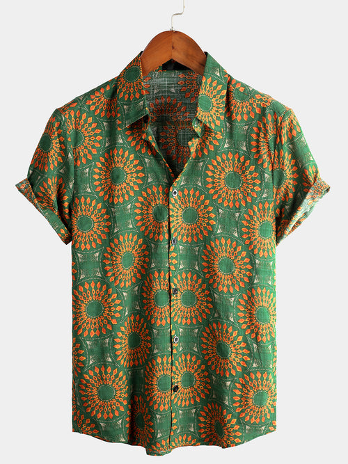 Men's Cotton Vintage 70s Floral Retro Button Up Green Summer Beach Bohemian Boho Short Sleeve Shirt