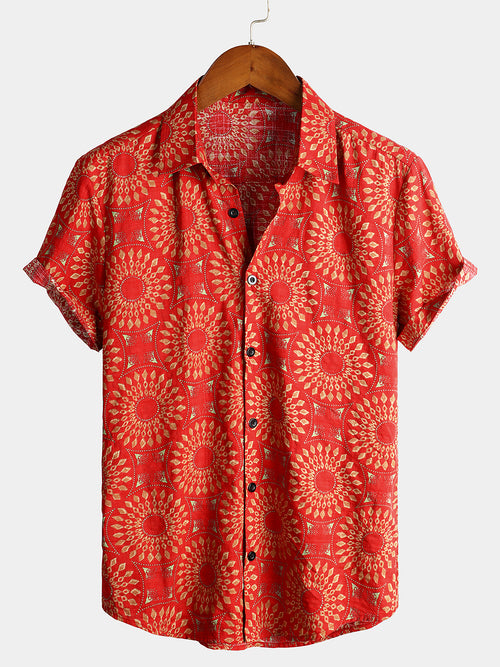 Men's Red Floral Vintage Short Sleeve Button Up Beach Tropical Hawaiian Shirt