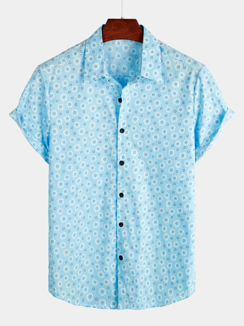 Men's Blue Daisy Floral Summer Button Up Hawaiian Short Sleeve Shirt