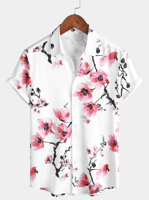Men's Cotton Floral Button Up Summer Short Sleeve Shirt