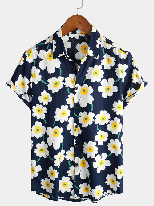 Men's Floral Cotton Daisy Flower Summer Beach Holiday Short Sleeve Hawaiian Button Up Shirt