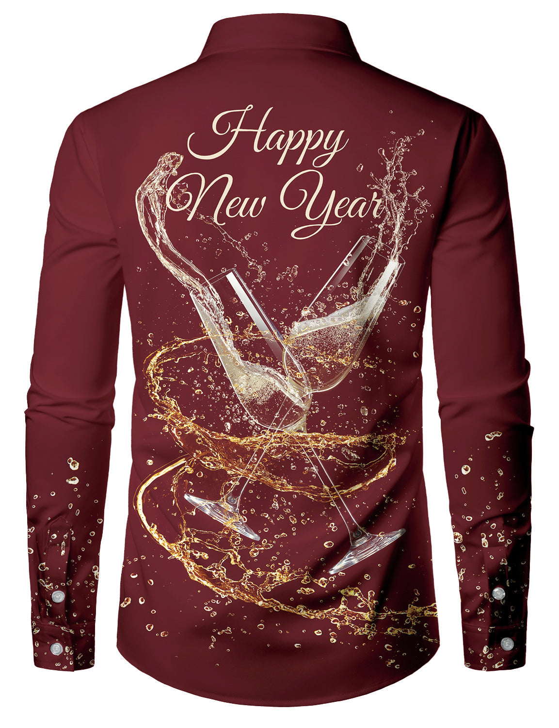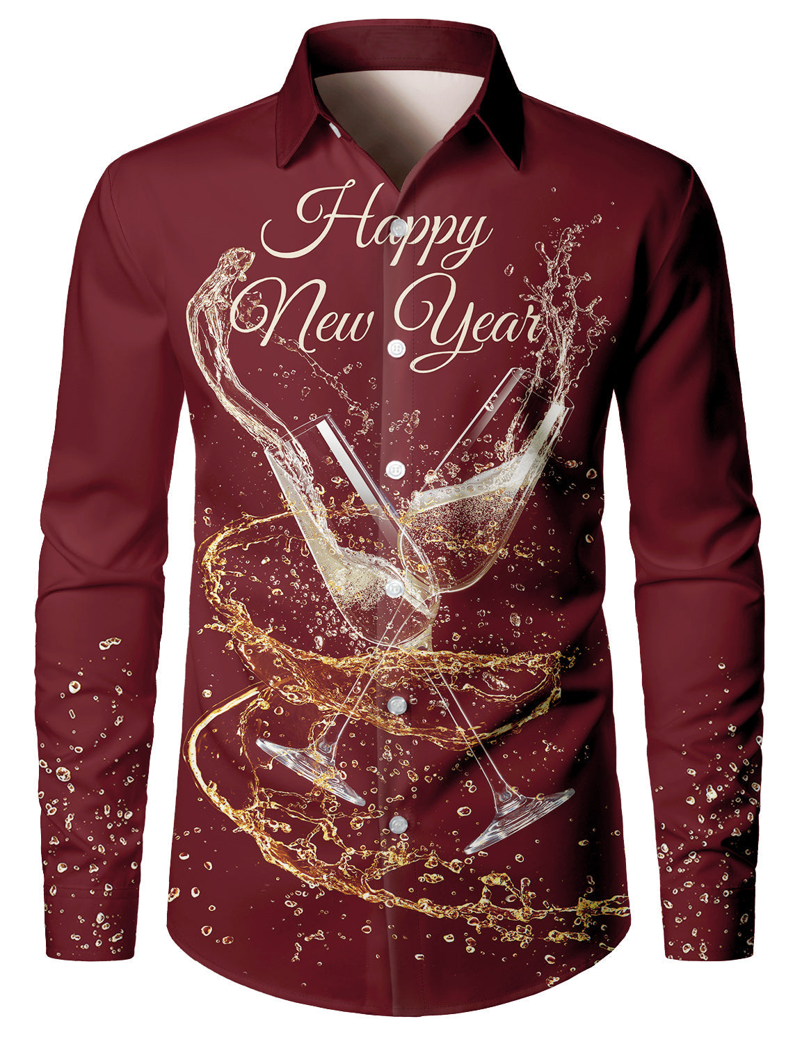 Men's Casual Holiday Wine Glass Print Red Long Sleeve Cotton Party Shirt