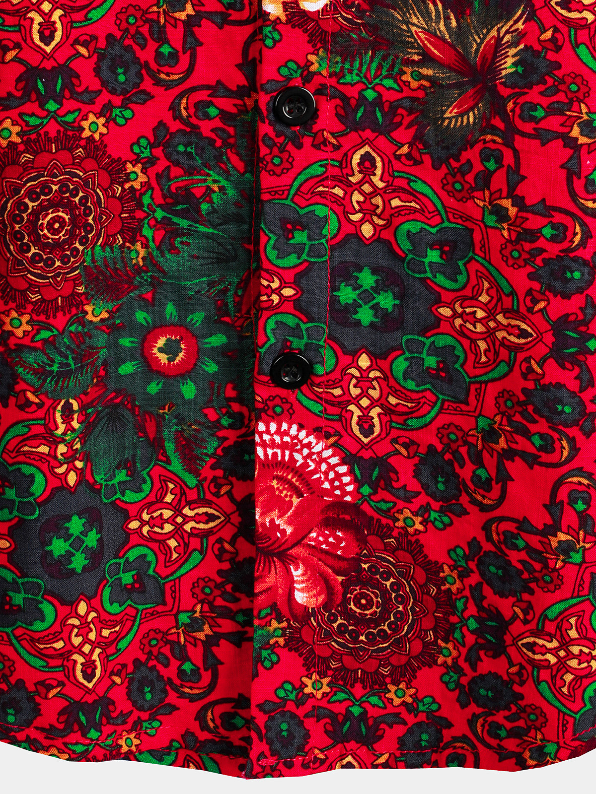 Red Men's Vintage Flower Hawaiian Cotton Shirt