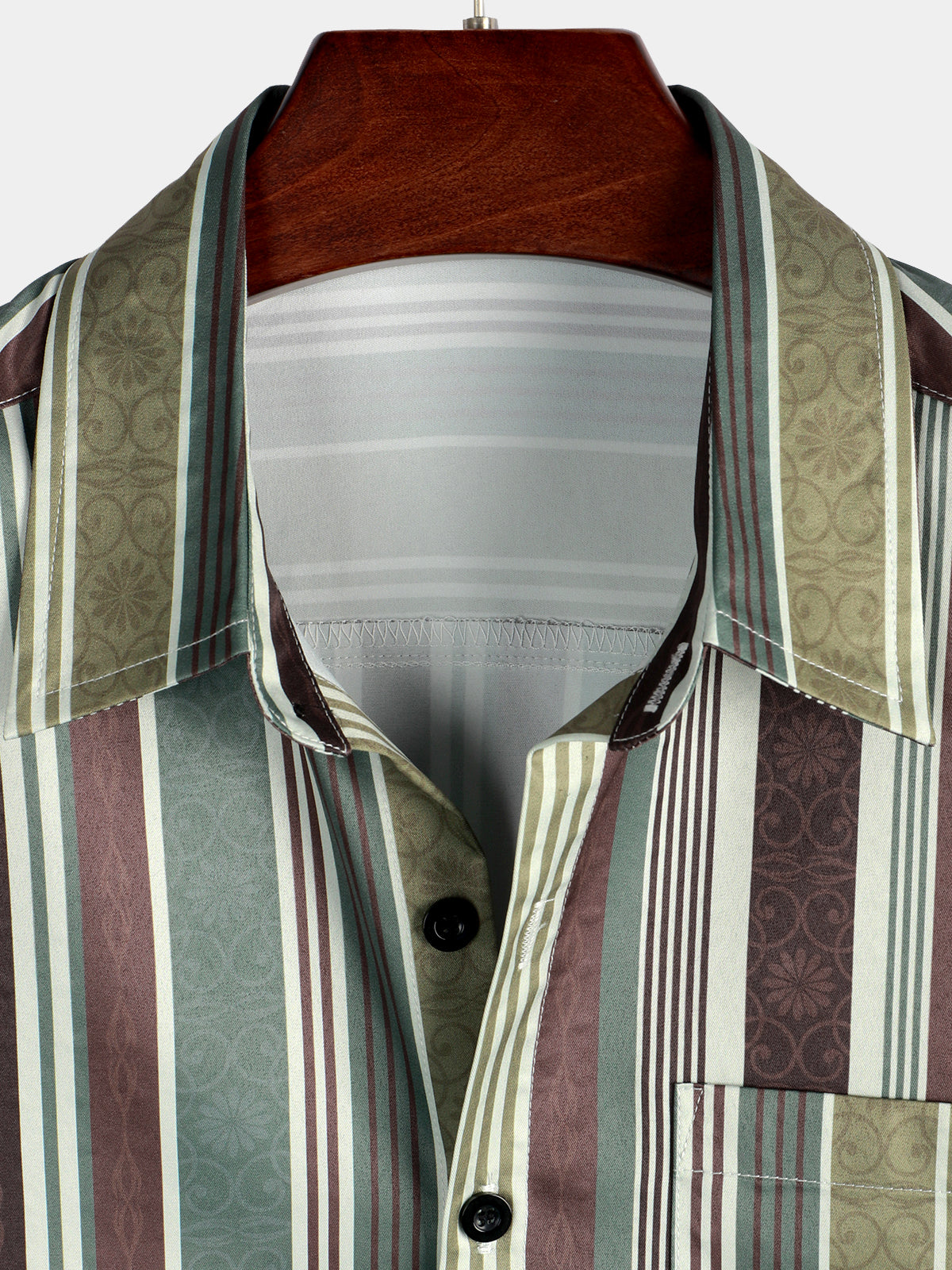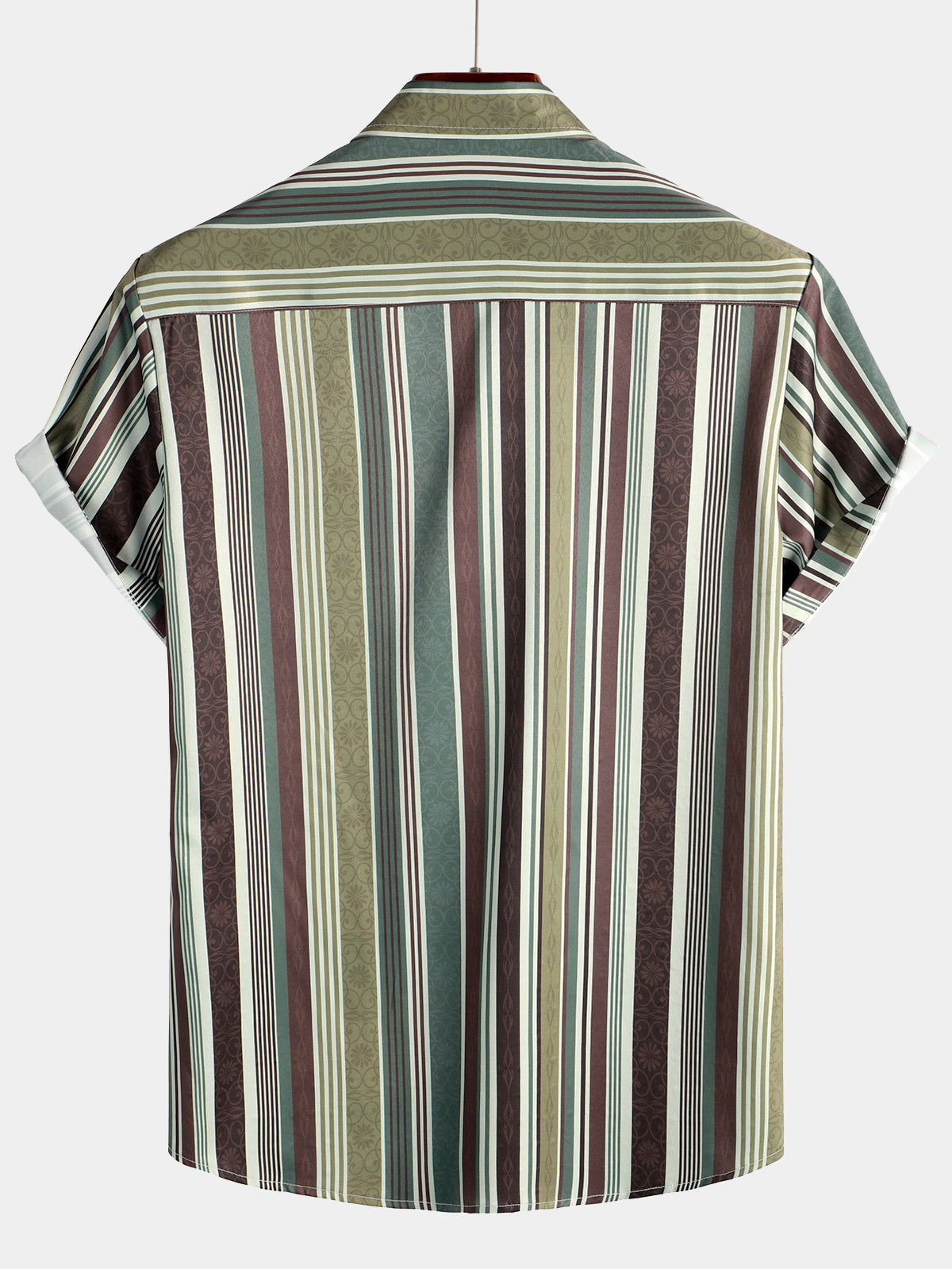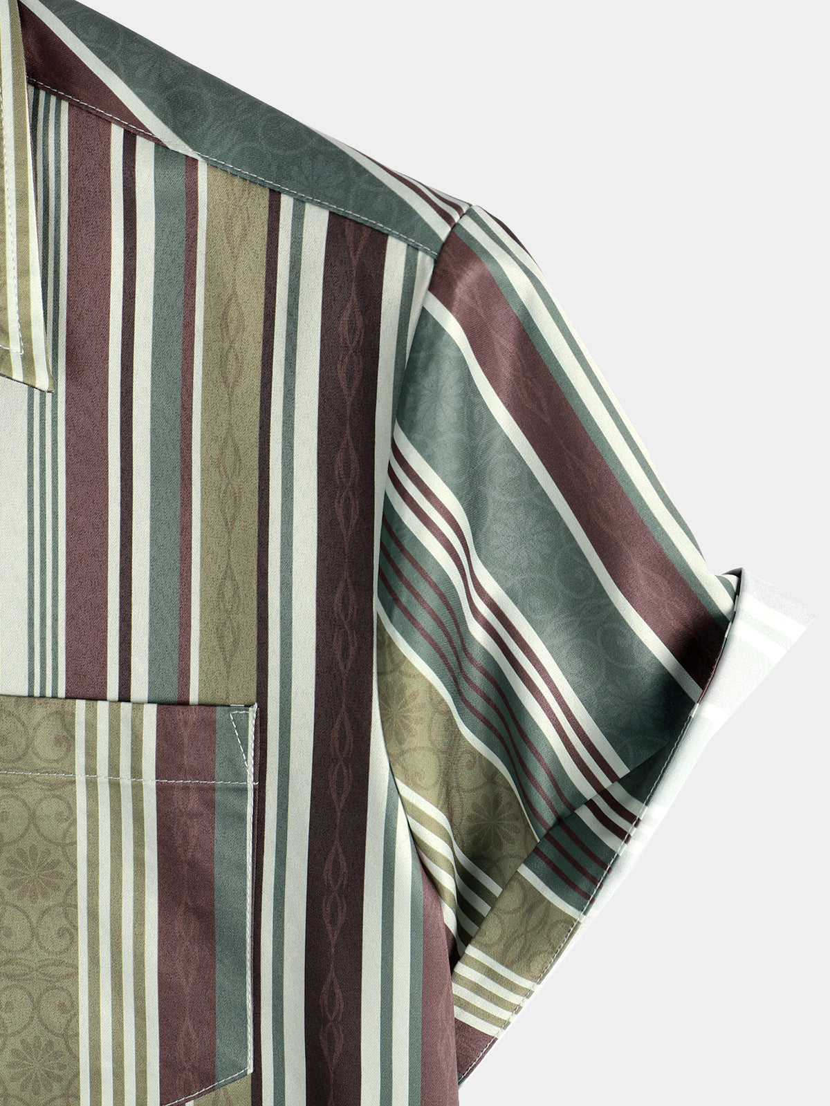 Men's Vintage Green And Brown Vertical Striped Button Up Pocket Short Sleeve Shirt