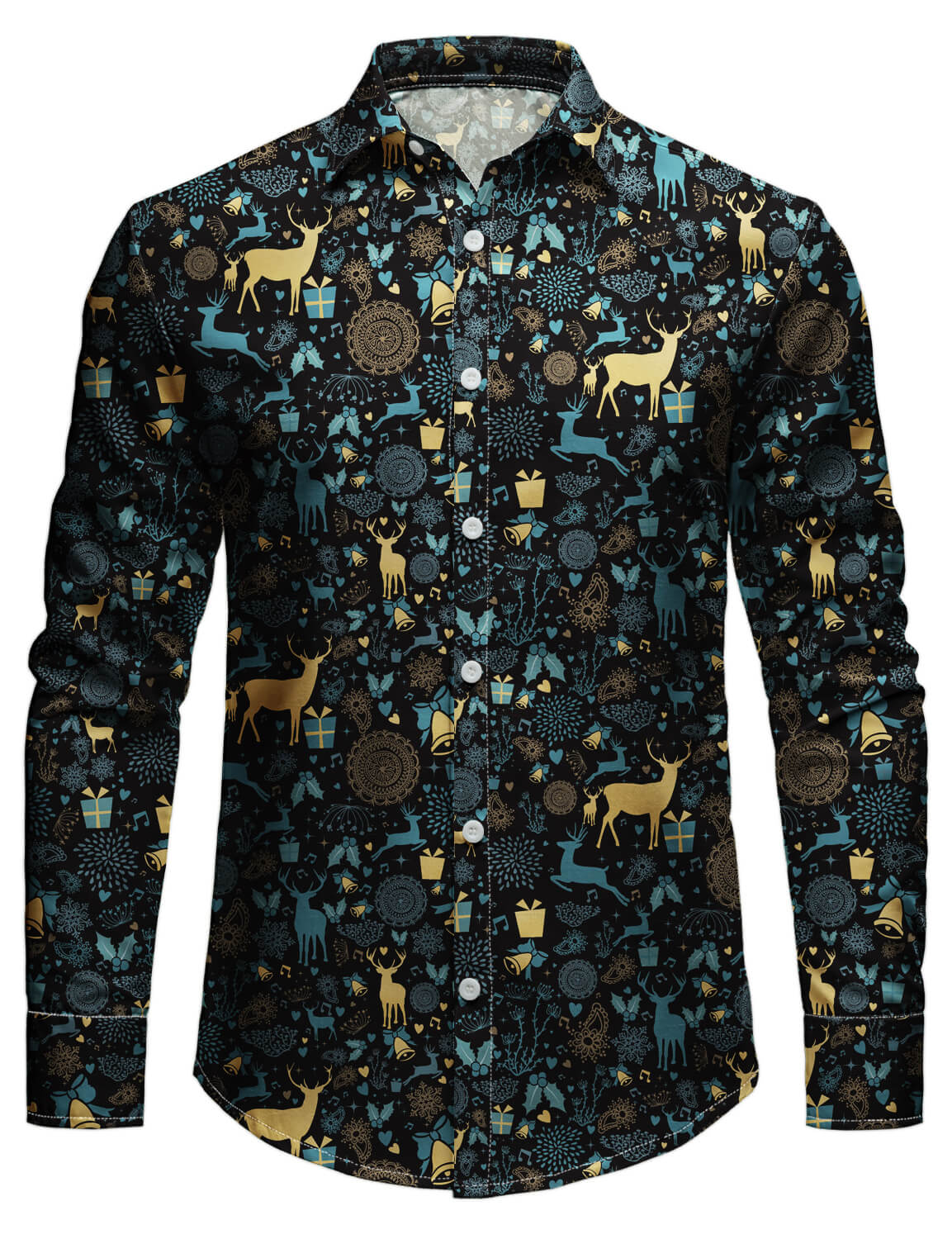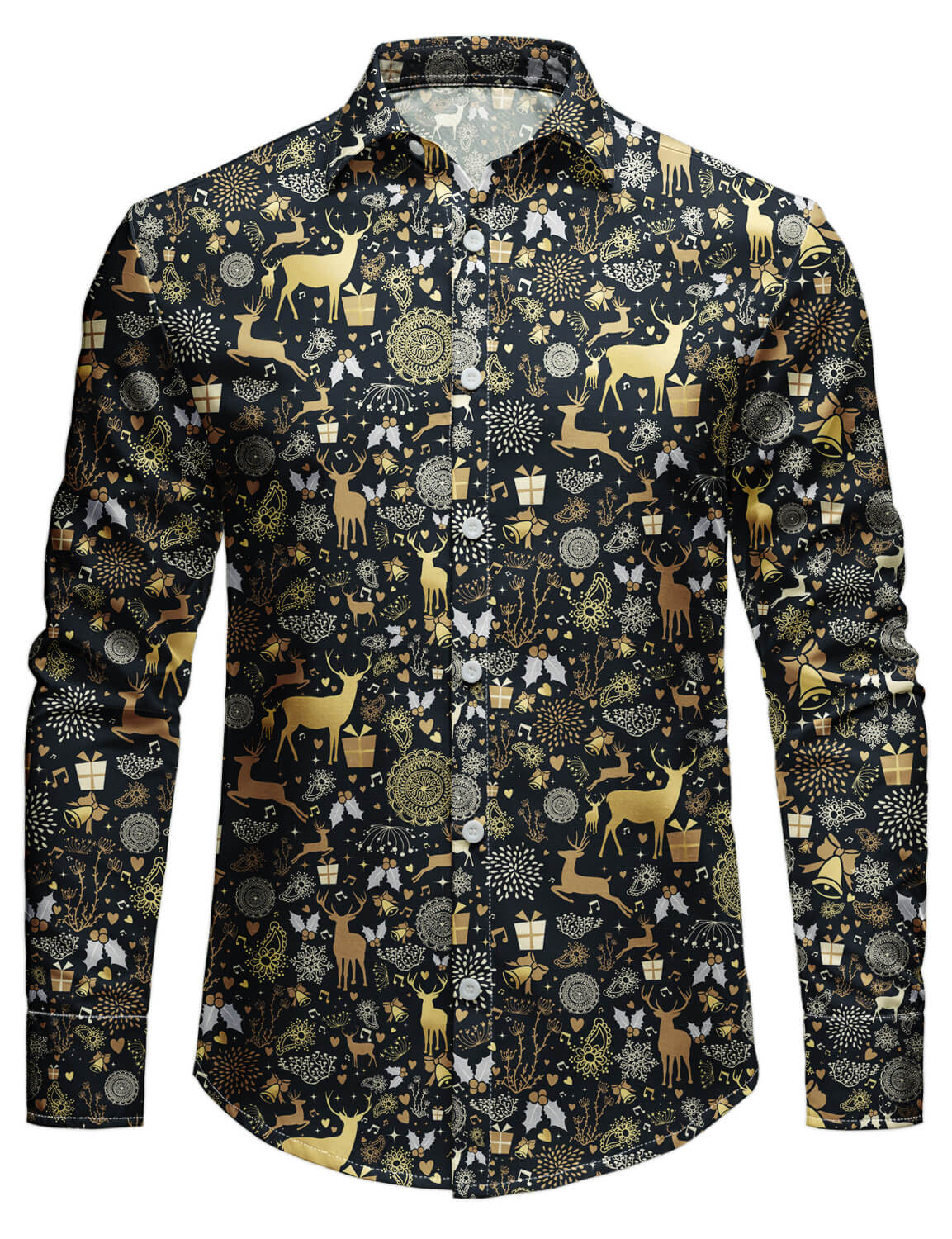 Men's Christmas Party Festive Shiny Gold Reindeer Stocking Print Long Sleeve Button Down Shirt