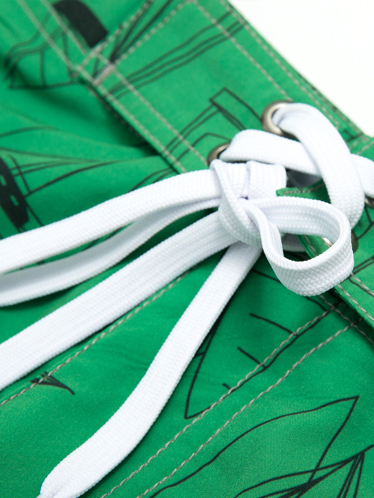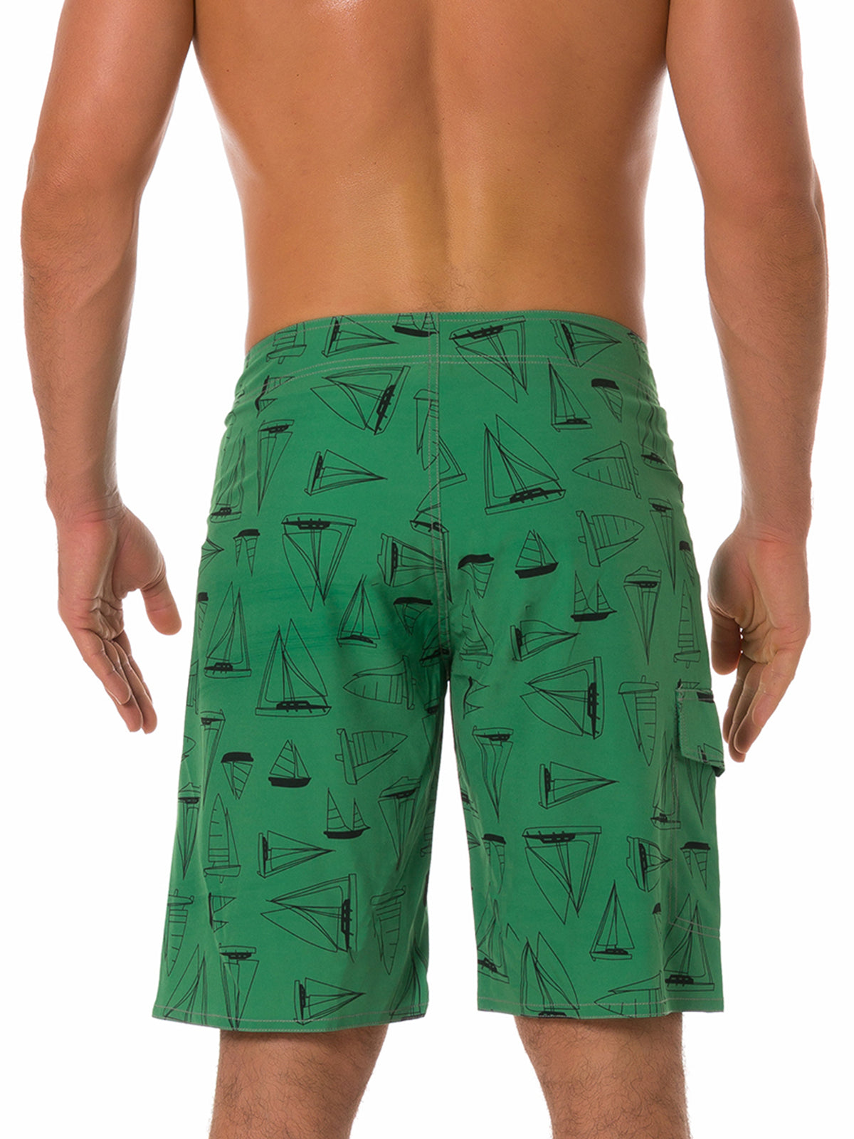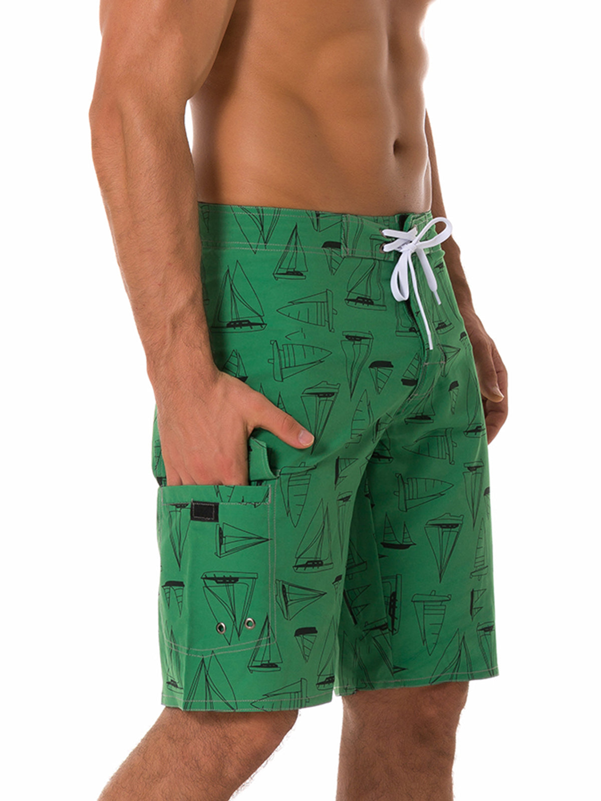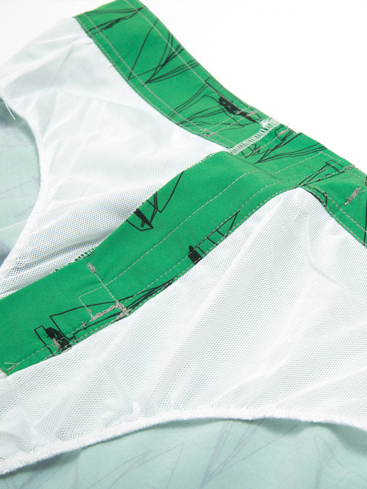 Men's Green Casual Sailboat Flat Waist Hawaiian Shorts Summer Beach Boardshorts