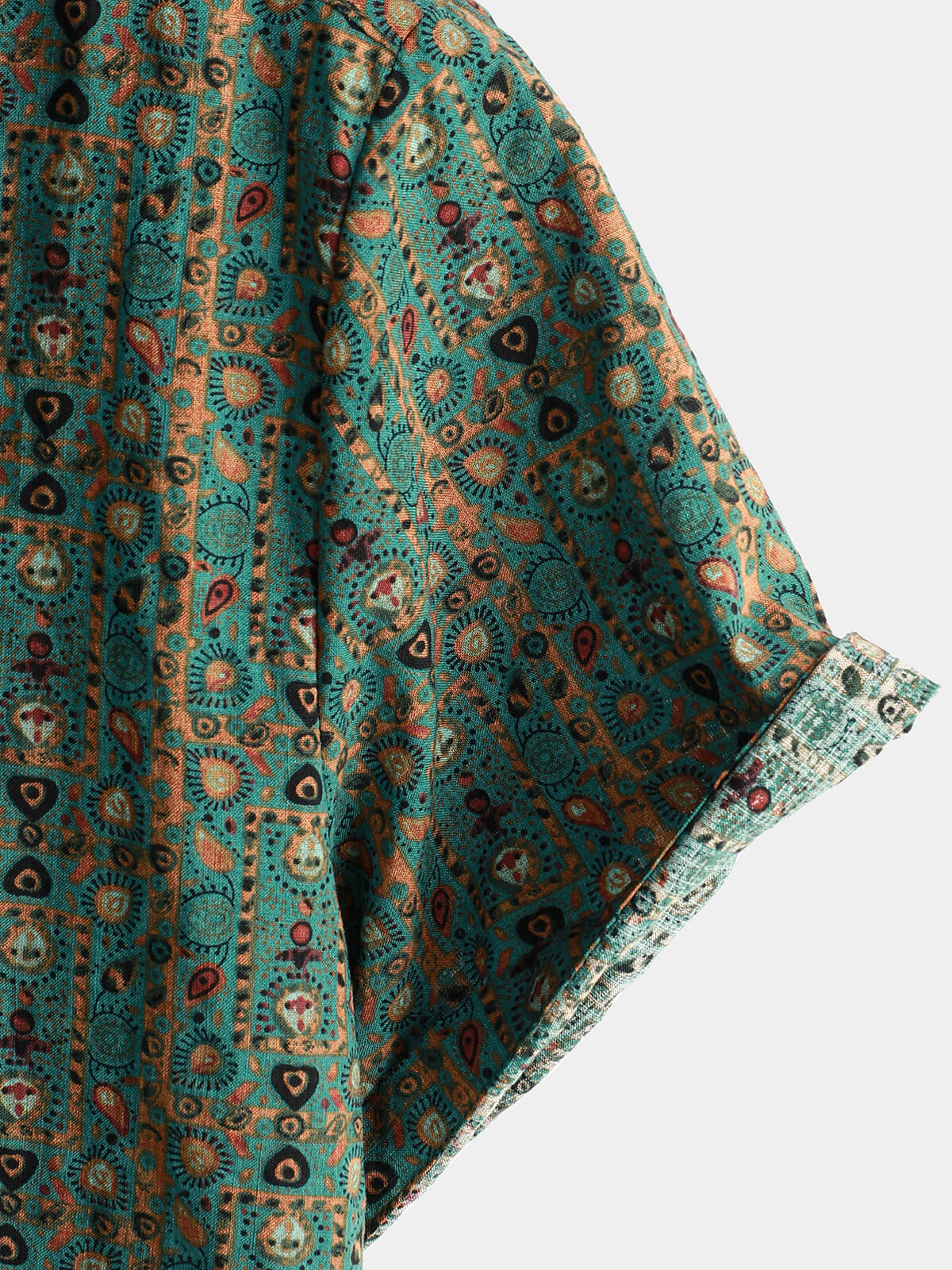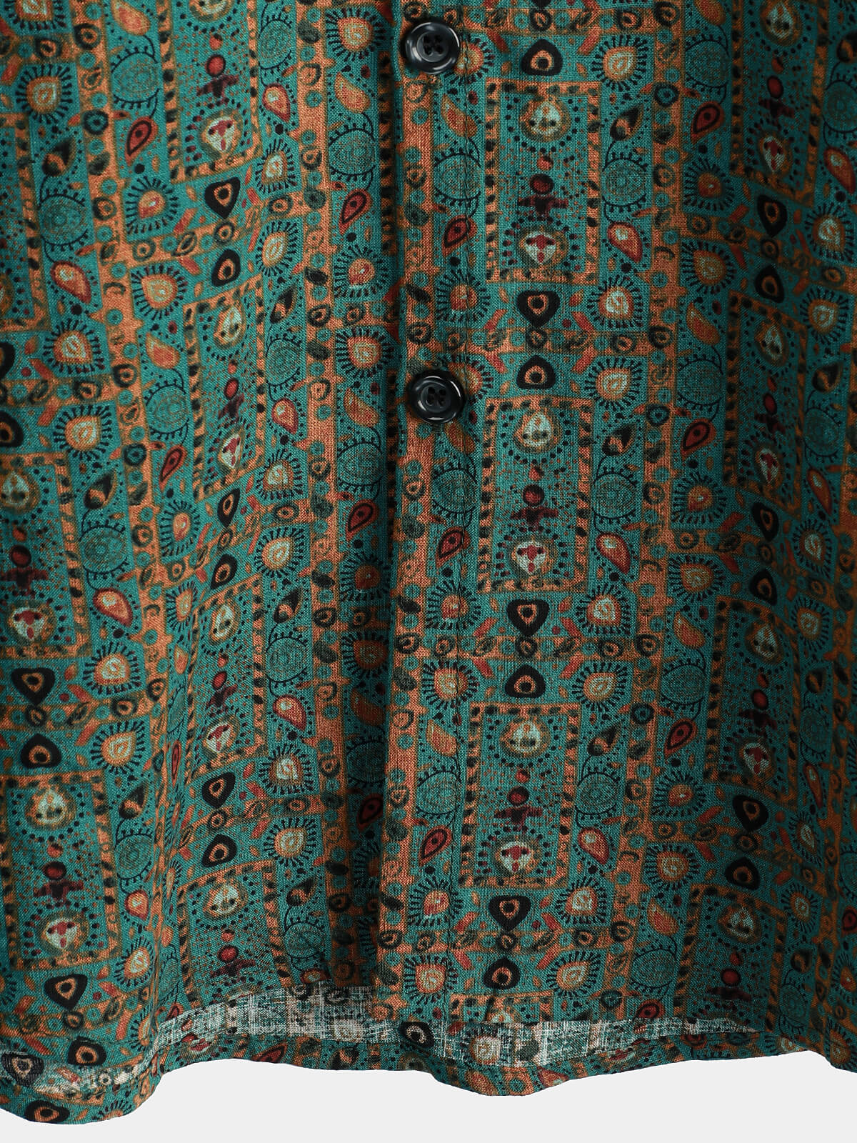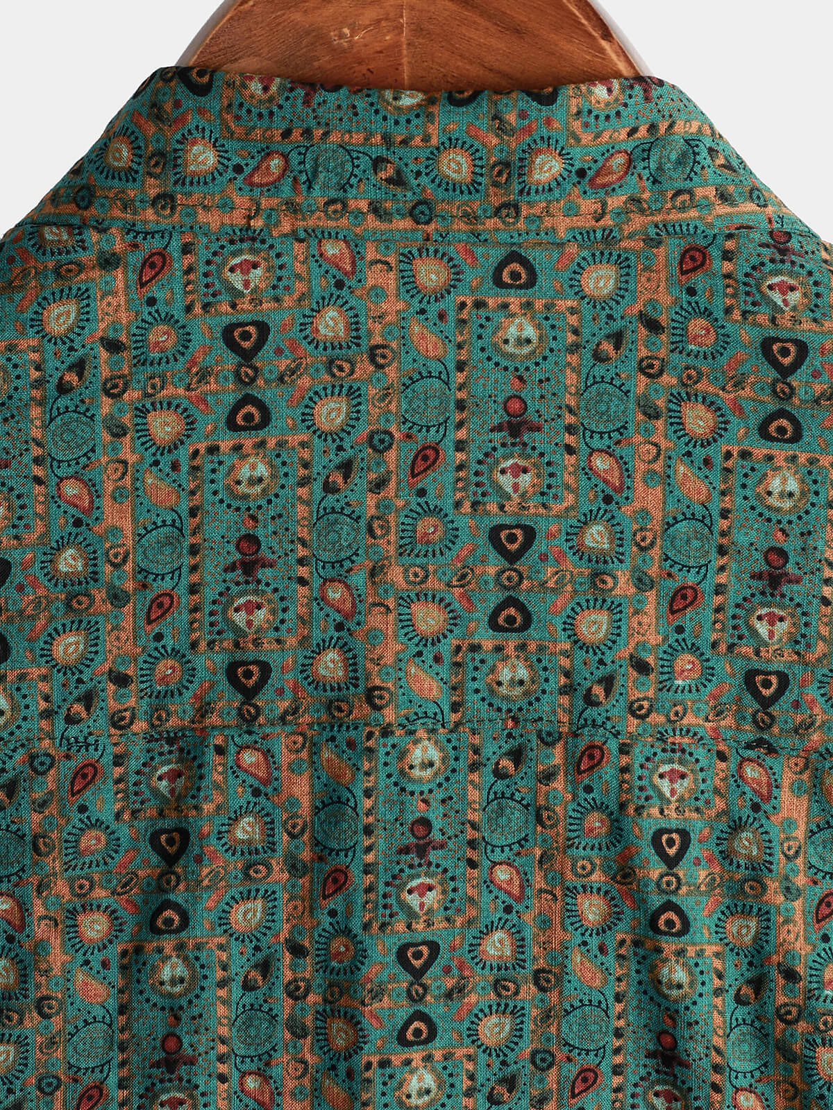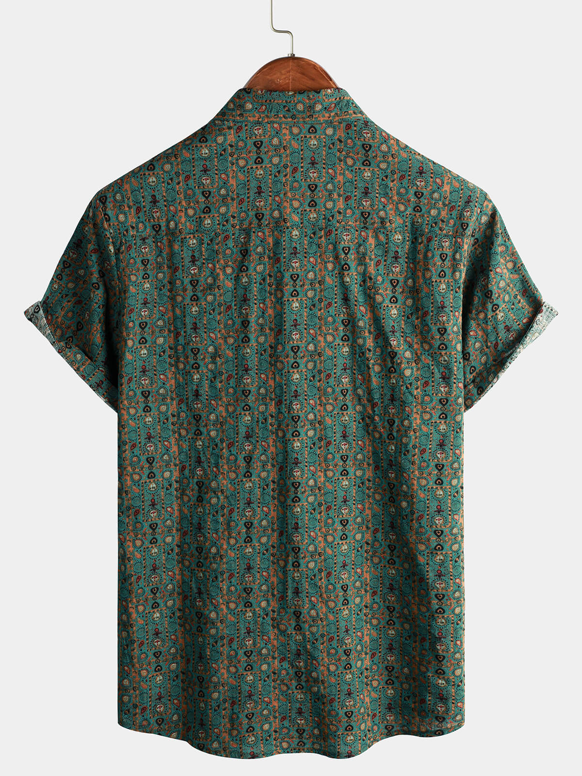 Men's Vintage Paisley Print 70s Button Up Green Boho Retro Tribal Short Sleeve Shirt