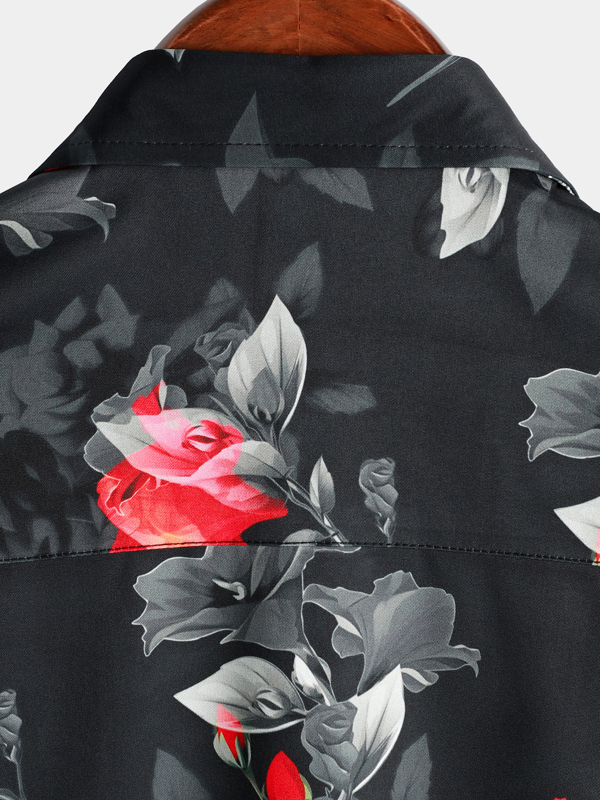 Men's Casual Floral Button Up Summer Beach Black Short Sleeve Shirt