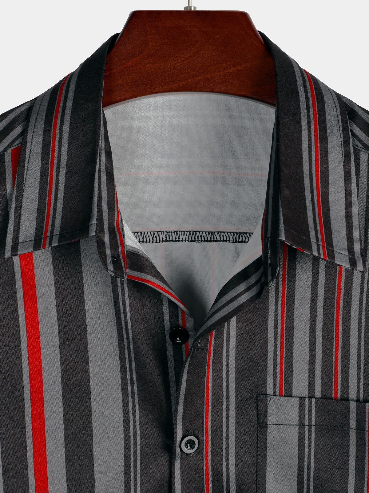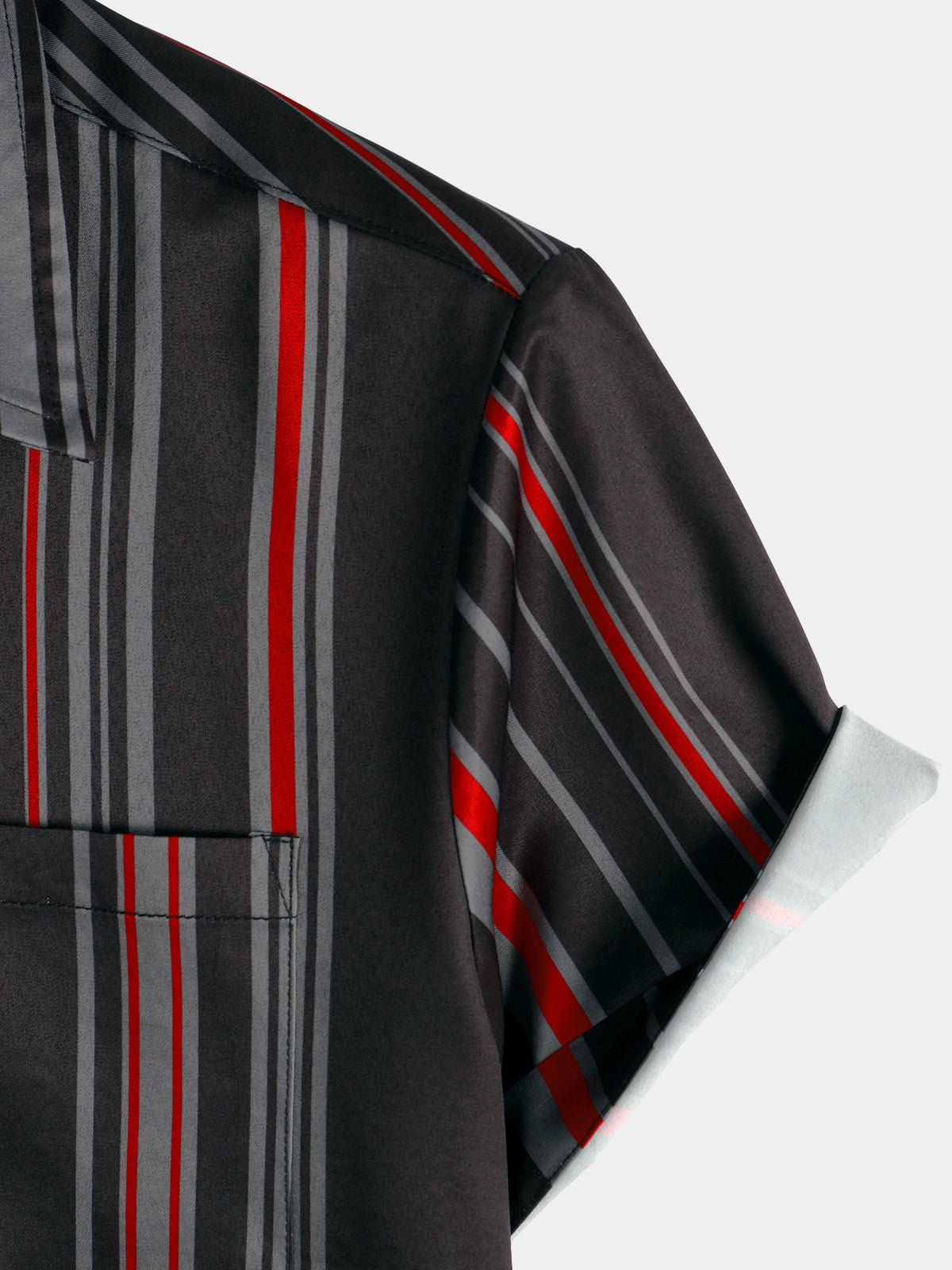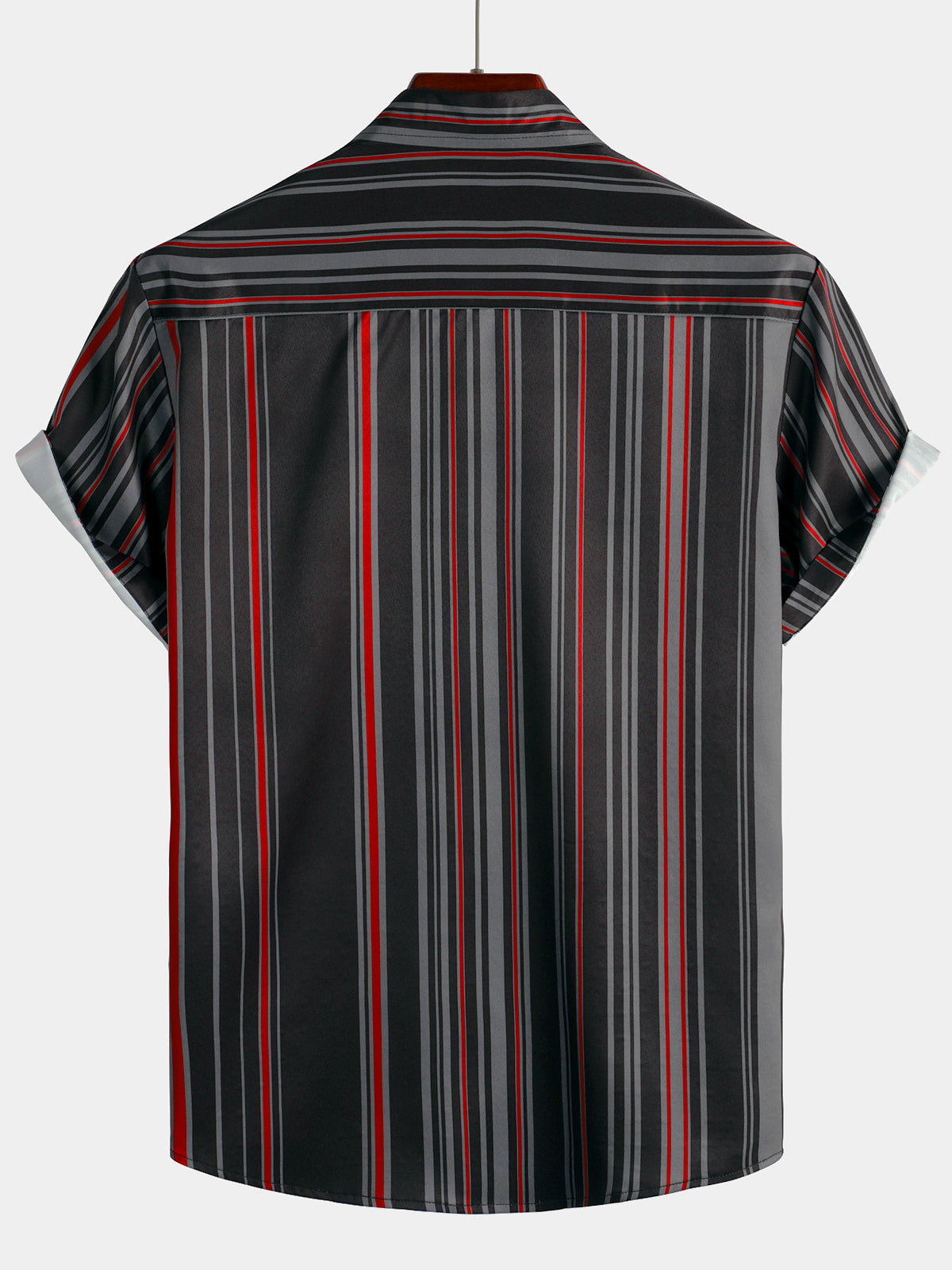 Men's Retro Black And Red Vertical Striped Pocket Vintage 70s Short Sleeve Shirt