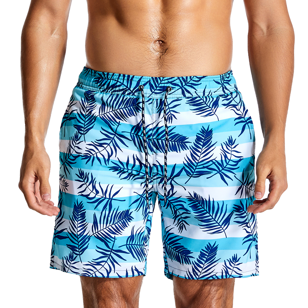 Men's Tropical Leaves And Striped Quick Dry Beach Shorts Swimming Trunks