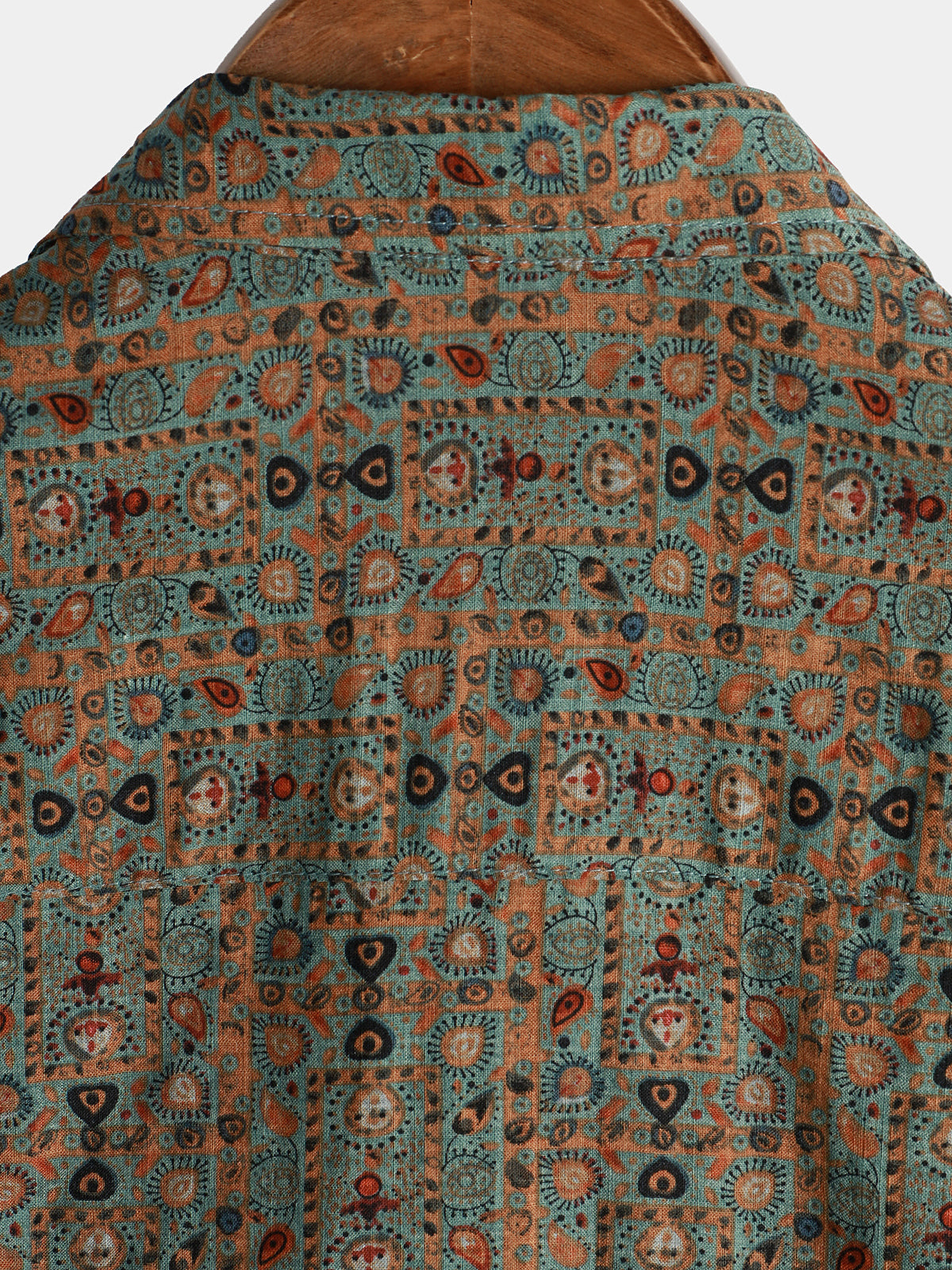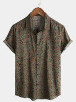 Men's Vintage Paisley Print 70s Button Up Brown Boho Retro Tribal Short Sleeve Shirt